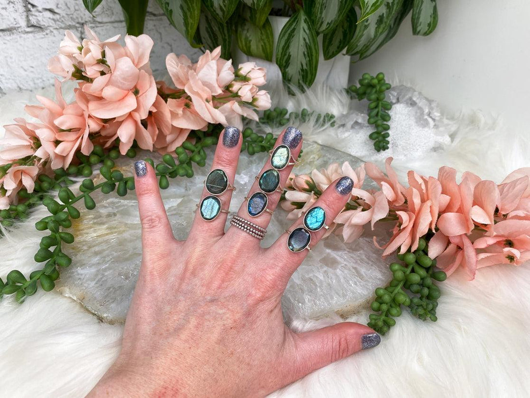 Crystal rings offer numerous benefits that go beyond their visual appeal, but don't think you have to choose a ring because of its healing properties.... it is OK to like a crystal ring for its visual aspect too! Each crystal carries its own energetic properties and vibrations, which can positively influence our physical, emotional, and spiritual well-being. Amethyst, known as the stone of spiritual growth and protection, is believed to enhance intuition, promote inner peace, and provide a sense of clarity. Labradorite, with its mesmerizing play of colors, is associated with transformation, intuition, and protection from negative energies. Moonstone, a stone of feminine energy, is believed to enhance intuition, balance emotions, and promote hormonal balance. Opal, with its captivating iridescence, is associated with inspiration, creativity, and emotional healing. These are just a few examples, as there is a vast array of crystals with their own unique benefits.