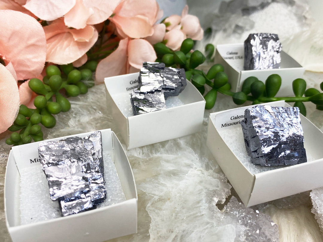We offer some Galena crystals in forms that may include raw forms like specimen boxes, clusters and others. We even have unique combinations with other minerals like quartz! Read more about galena at the bottom of the page!