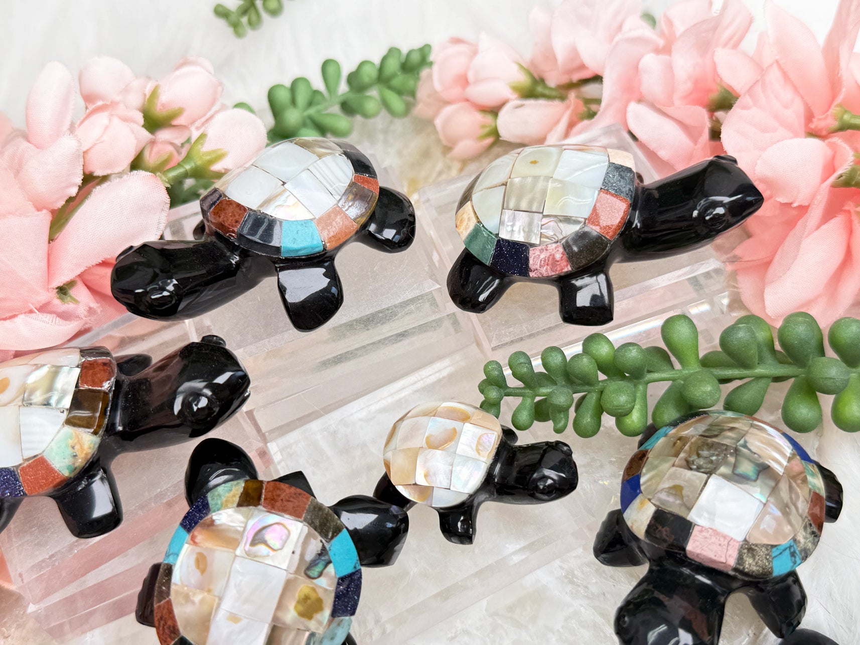 Each obsidian turtle is unique, showcasing a combination of these stones, but they all carry the same overall look that captures the essence of the turtle as a symbol of protection, longevity, and transformation. Placing one of these turtles in your space not only adds a touch of charm but also infuses it with the positive energies and healing properties of these remarkable gemstones, creating a harmonious and inspiring environment.