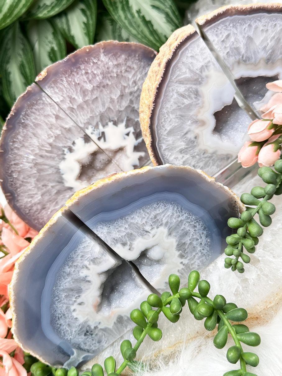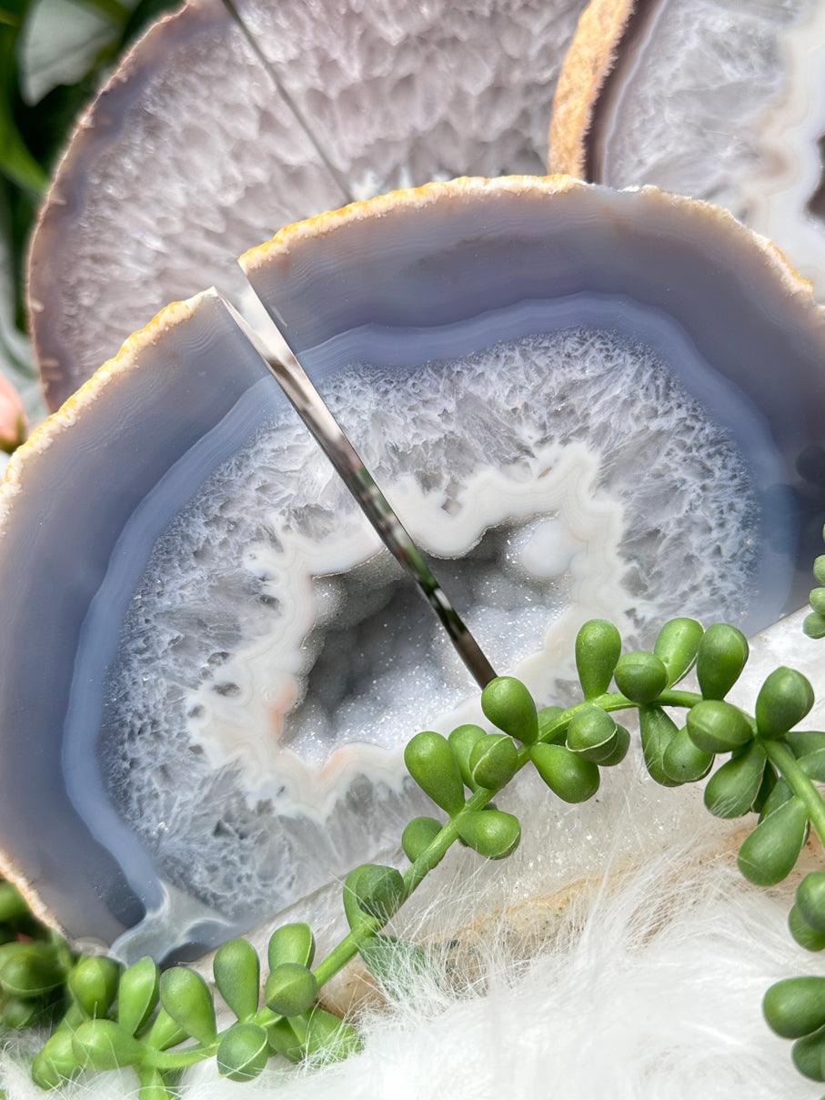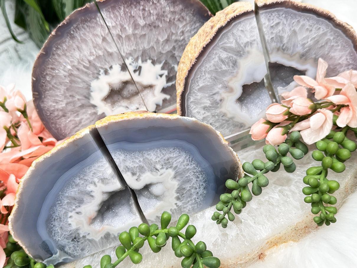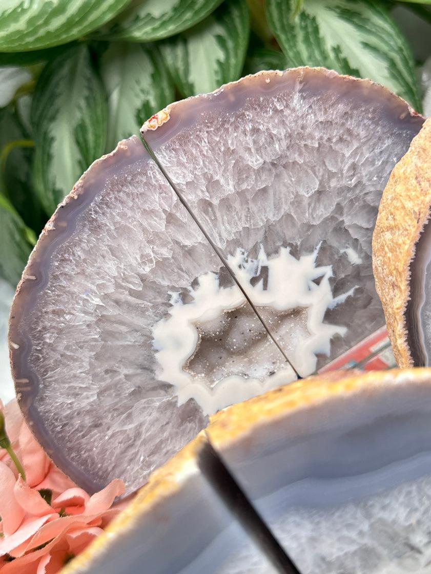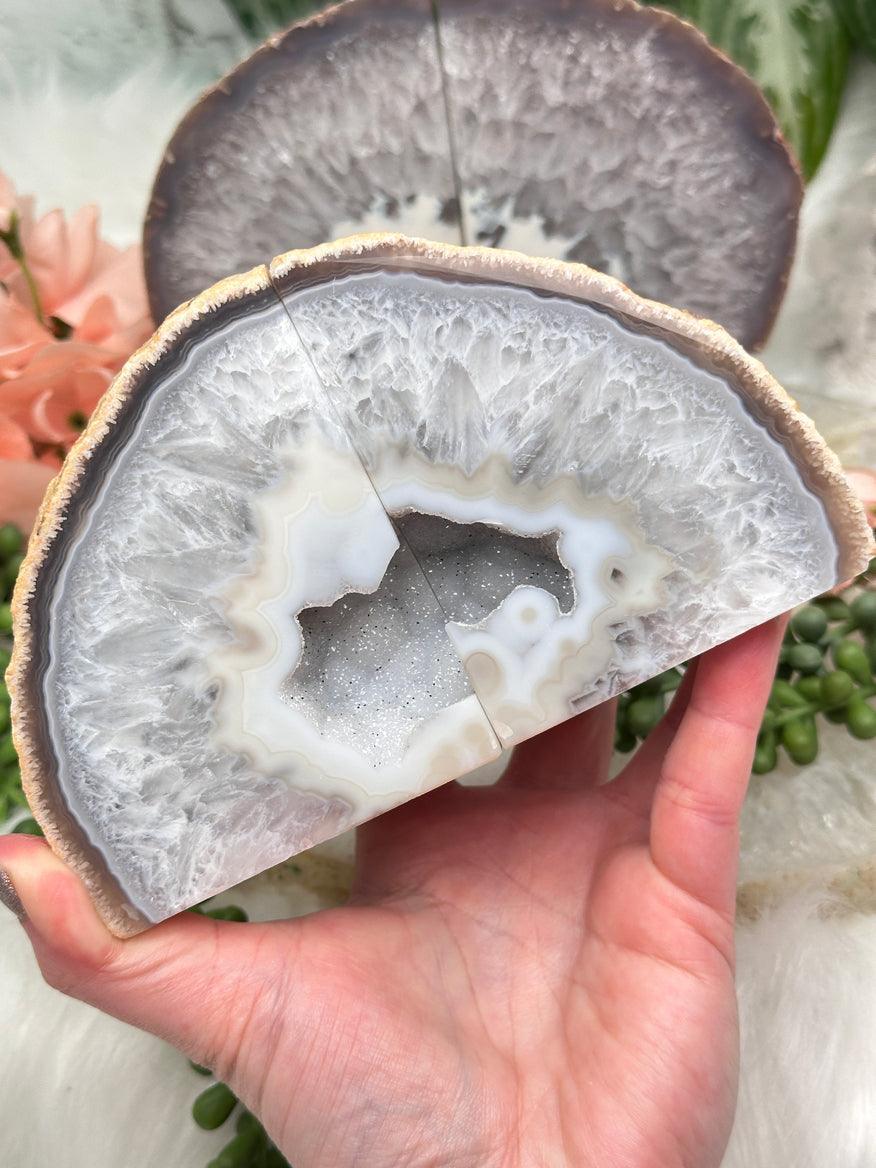 Adorable and unique natural agate crystal bookends. A variety of colors and formations, but they all have some cluster pockets! These have an adorable tiny druzy chalcedony in the center which sparkles under the right lights. Most of these will actually look cute both ways you turn them - you can see what I mean in the video. These are perfect for any home decor theme! Choose your exact set in the dropdown menu.