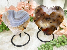 Beautiful gate slice hearts with a beautiful quartz and chalcedony mixes from Brazil.  Some even have druzy spots. Two of them come with stands (they are shown in them), and the others will not. All unique in their own ways. I've even seen people use these in front of a light too. Both sides are fully polished.Â