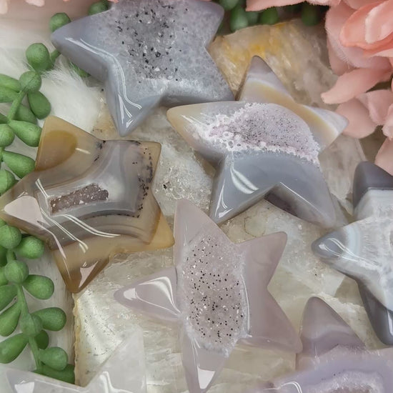 Adorable little agate star crystals in a variety of colors and patterns! You'll want to take a look at the photos and videos for the best look. There are some that are nearly all white quartz, some that are gray, some with a little iron causing them to be a yellow. All have a least a small pocket.