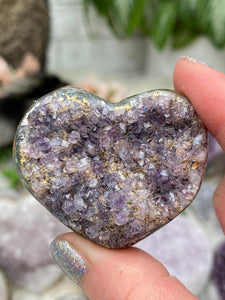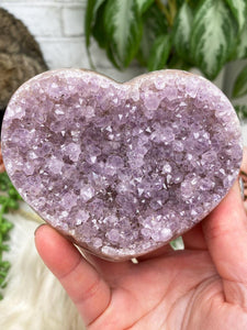 Nice cute amethyst cluster heart crystals each unique in their own way. Some are from Brazil and some are from Uruguay. The Uruguayan ones are noted with a sticker on the back in the videos (sticker is now removed). Different color options from dark purple to light, red amethyst, and nearly white quartz with some pink edges. Some gray and more! Super sparkly pieces, take a look at the videos! Great pieces for a nightstand, side table, or desk. Tons of variety in these amethyst hearts. They can only lay flat, but you might be able to prop them up against something so they sit kind of on their sides.