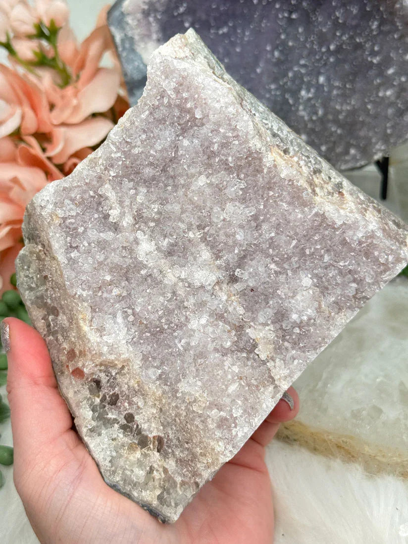 Super cute amethyst geode pieces & clusters from Brazil! Some are geode ends (like if you opened a rock), some are clusters, and some just pieces. The large standing amethyst with white chalcedony has 'sugar' druzy coating all over it!! Beautiful formations and a cute look. These would be great for a boho house, beach decor, or really any home theme. Take a look at the video to see how each one sits and also for a full 360 look. Please note that none of these are UV reactive.
