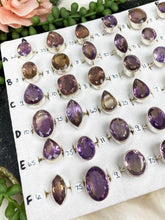 Stunning sterling silver Ametrine rings from Brazil. These rings feature a simple sterling silver band, and thick silver casing around the stone. The actual ametrine stones are going to be in a variety of colors and cuts. Some will be mostly amethyst, some will be mostly citrine, and some will be a blend of both. The shapes are a mix of oval, square, pear, double points, and more. The actual cuts are going to be a mix as well with some having a fully faceted face, and some will have a flat face with faceted sides. Take a look at the video to see more details. Sizes 6.5 - 11 available. Sizes are noted in the little stickers to the left of each ring.