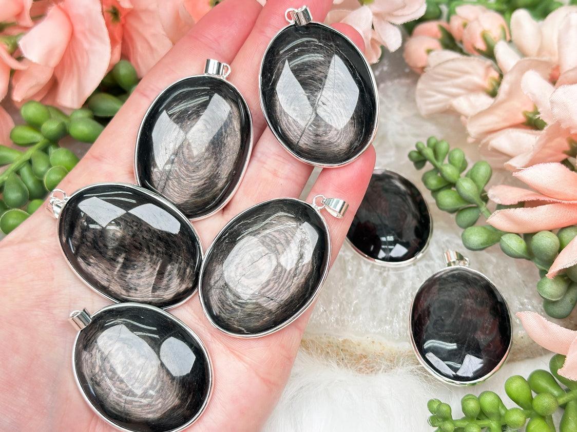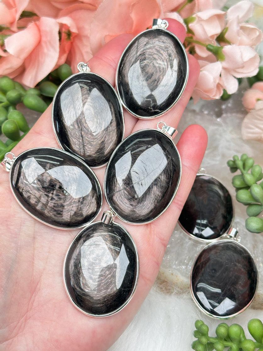 Beautiful simple and elegant Black & Brown Hypersthene Silver Pendant Necklaces. Hypersthene is a stone full of power and strong energy! It appears to be mostly a black (super dark brown) color at all times, but when it hits the light, it will flash a beautiful brown color. The patterns of the hypersthene stone's flash will vary, some are more solid, some have lines, and some are circular.
