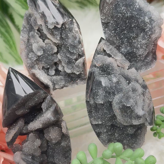 These adorable and unique Sphalerite flames have tons of personality with their dark gray, nearly black color, and druzy fronts. They all have a sparkling druzy quartz face (some have multiple). Polished backs that still have some of their natural surface and druzy pockets. Some have really cool peek-a-boo holes and unique formations.