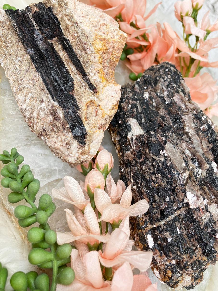 A mixture of different formations of Black Tourmaline and Mica from Brazil. Plus some pieces that have albite, and some with quartz. A couple of the larger pieces are just raw crystals, and the smaller ones are mounted on little wooden stands (cannot come off). Choose your exact piece! Please note that due to the nature of these crystals, they will likely 'shed' some small pieces in transit, but not majorly.