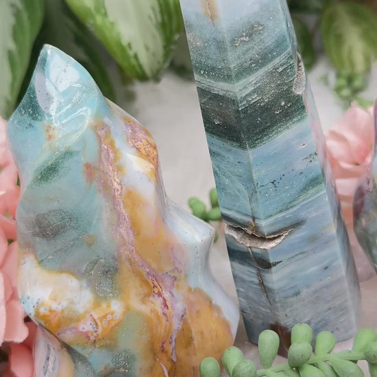 Stunning Ocean Jasper crystals with beautiful blue and green colors. There are two flames and a point. The two flames have an overall green and blue look, but mixed with yellows and hints of pink or red. The bigger one on left has black on the back even with a few pyrite flakes.The point in center has a cool almost horizontal stripe pattern with a couple of open pockets. They of course have other colors mixed within them, so take a look at the photos and video for the best look at them! Â