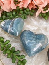 Such a vibe on these soothing blue onyx heart crystals from Mexico! An overall blue color with some green hues and orange spots in some of these. A few also have some banding to them. Great size for meditation if you want! Blue onyx is far less common that many of the other onyx colors from Mexico. It is sometimes referred to as blue lemurian aquatine or blue calcite too.