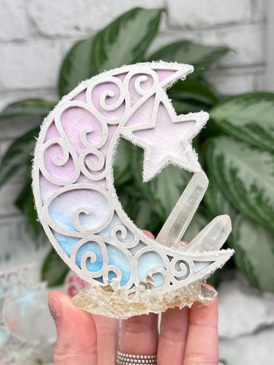 **Please note the resin base has yellowed - That is why they are clearanced.** These quartz and resin crystal moon displays are all one of a kind creations made by yours truly! Each piece features a watercolor moon with a wood backing. A mixture of natural quartz crystals, glass, and resin combine to create the super sparkly geode look.