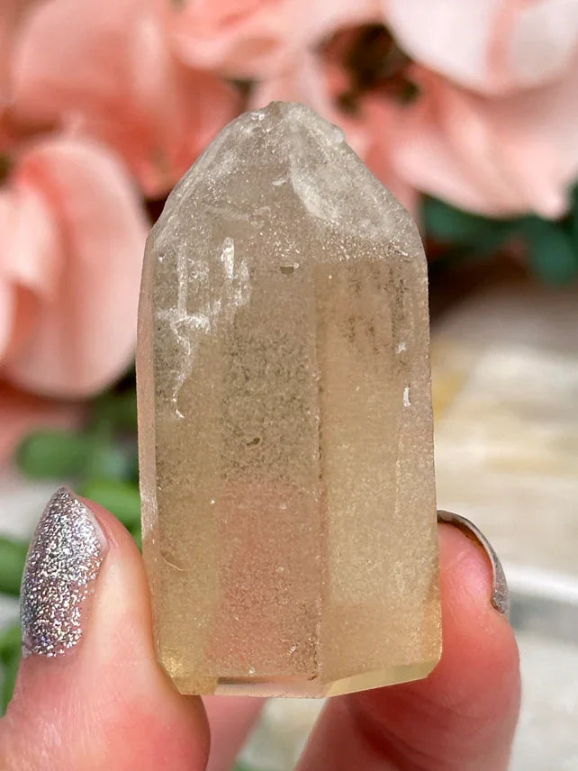 Cute polished natural citrine (not heat treated) crystal points that are real citrine stone from Brazil. Their natural state is why they have a very light tanish yellow coloring. These are perfect for your desk, or to place in the 'prosperity corner' of your home. Some are a bit 'smoky' in their hue so they are darker or a bit more brown than others, some even have iron giving a more yellow look. These are mostly fully polished points, but a couple have natural faces. Some are higher quality than others.