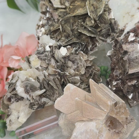 Super cool pieces of tan and brown Muscovite Mica with White Cleavelandite (Albite) from Brazil. Two have these have a more rare star formation, as well as some smoky quartz (front two). These unique crystal specimens can sit a couple of ways depending on the look you want to go for. Truly one of a kind! You will want to take a look at the video to see them in a 360 view.