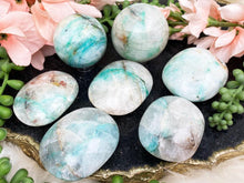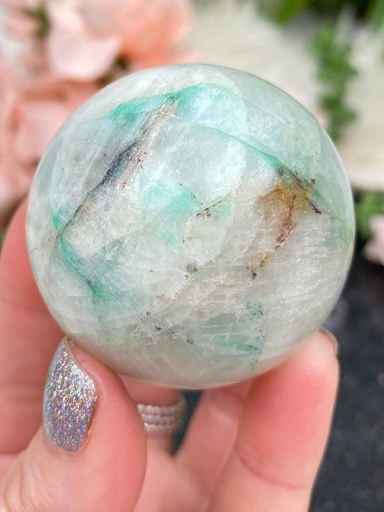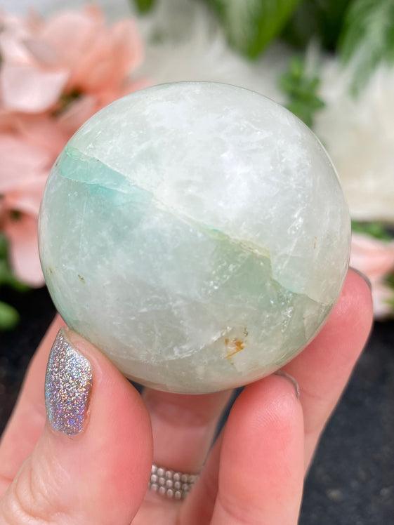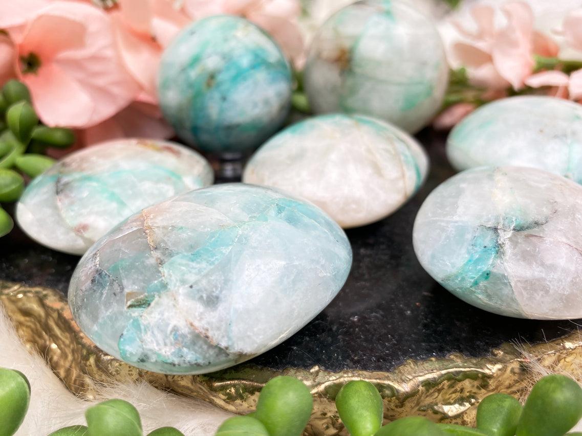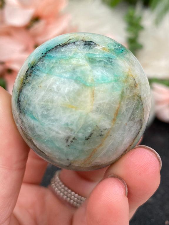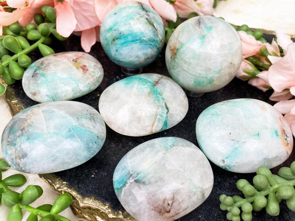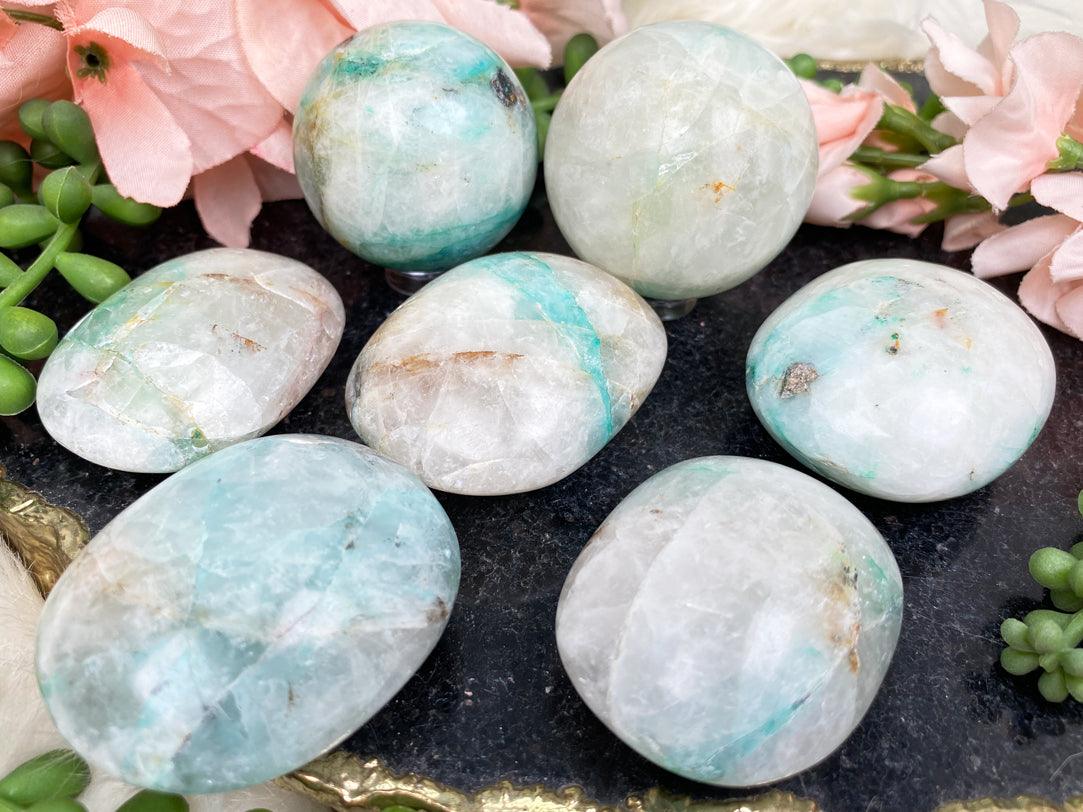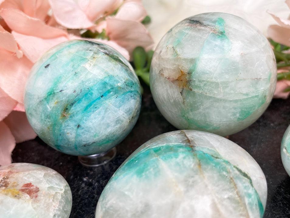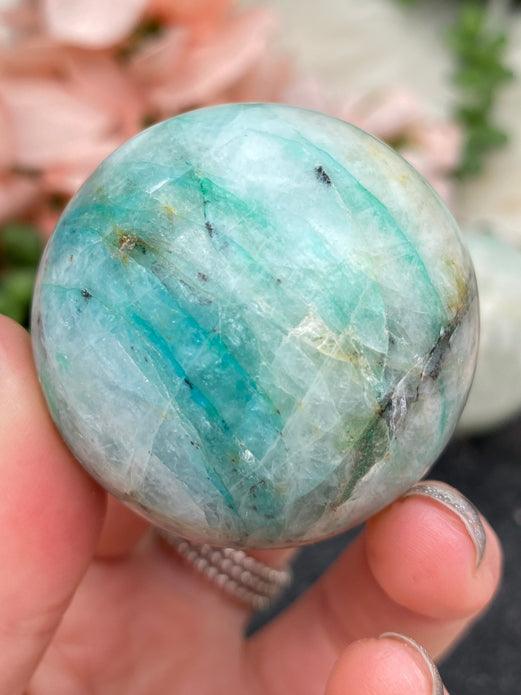 Beautiful crystal spheres and small palms with a combination of Blue Chrysocolla and Quartz from Peru. These Chrysocolla spheres have a vibrant natural teal blue coloring with white quartz and hints of black and brown throughout.  They are fully polished and natural, but please note that many of these pieces have 'fill spots' where they used a mix of resin and natural crystal dust to fill in holes to help with stability.  One of the smaller spheres and the palms are more of a white coloring with some lighter hints of the chrysocolla.