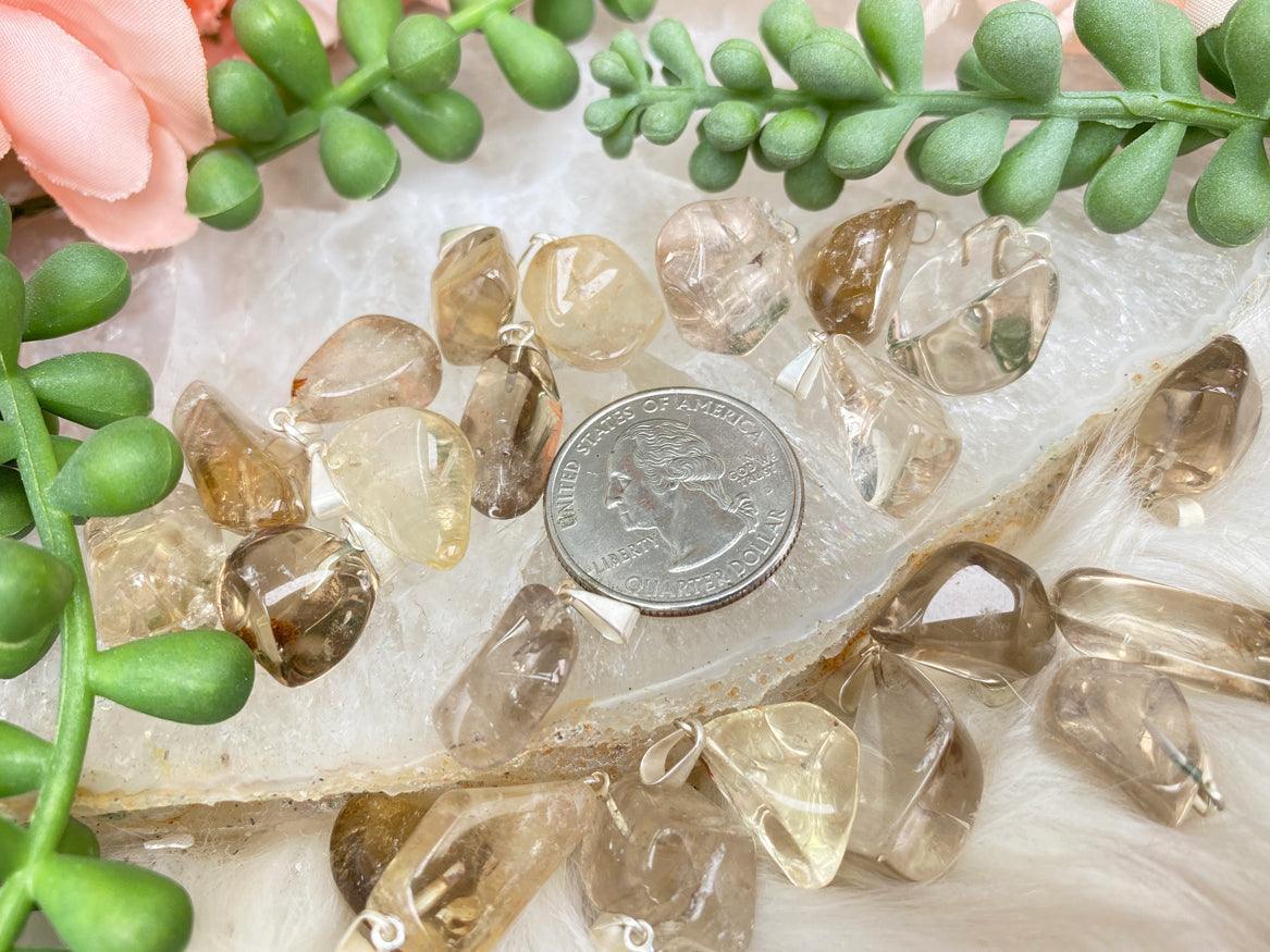 Simple and classic polished natural citrine necklace from Brazil. These citrine crystal necklaces feature a small stone on a 16" sterling silver snake chain. These are natural citrine (aka not heat treated), so they vary in color from a light tan, to slightly yellow, and some are smoky in color depth. The polished crystals are a tumble style, so they are all unique in shape and size as well.
