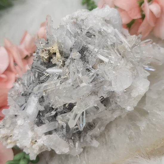 Amazing Gray Colombian Lithium Lemurian Quartz cluster with a hint of chalcedony as well. Overall coloring is white and gray mixed together. Amazing all over, and all of the points are growing together and mixing. Super detailed and tiny points mixed between chunkier ones. Great for a side table, or your desk. Will sit a couple ways. Not a perfect piece, and it does have some breakages.