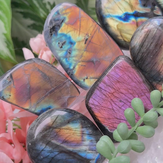These labradorite freeform crystals have flashes in an array of color options. Some have. a rainbow of colors, some purple, pink, orange, yellow, blue and green options. You will definitely want to watch the video for the best demonstration of the flash colors. These Labradorite crystals are from Madagascar.  When they don't flash, they have a gray to black coloring. Some will flash just sitting on a shelf.