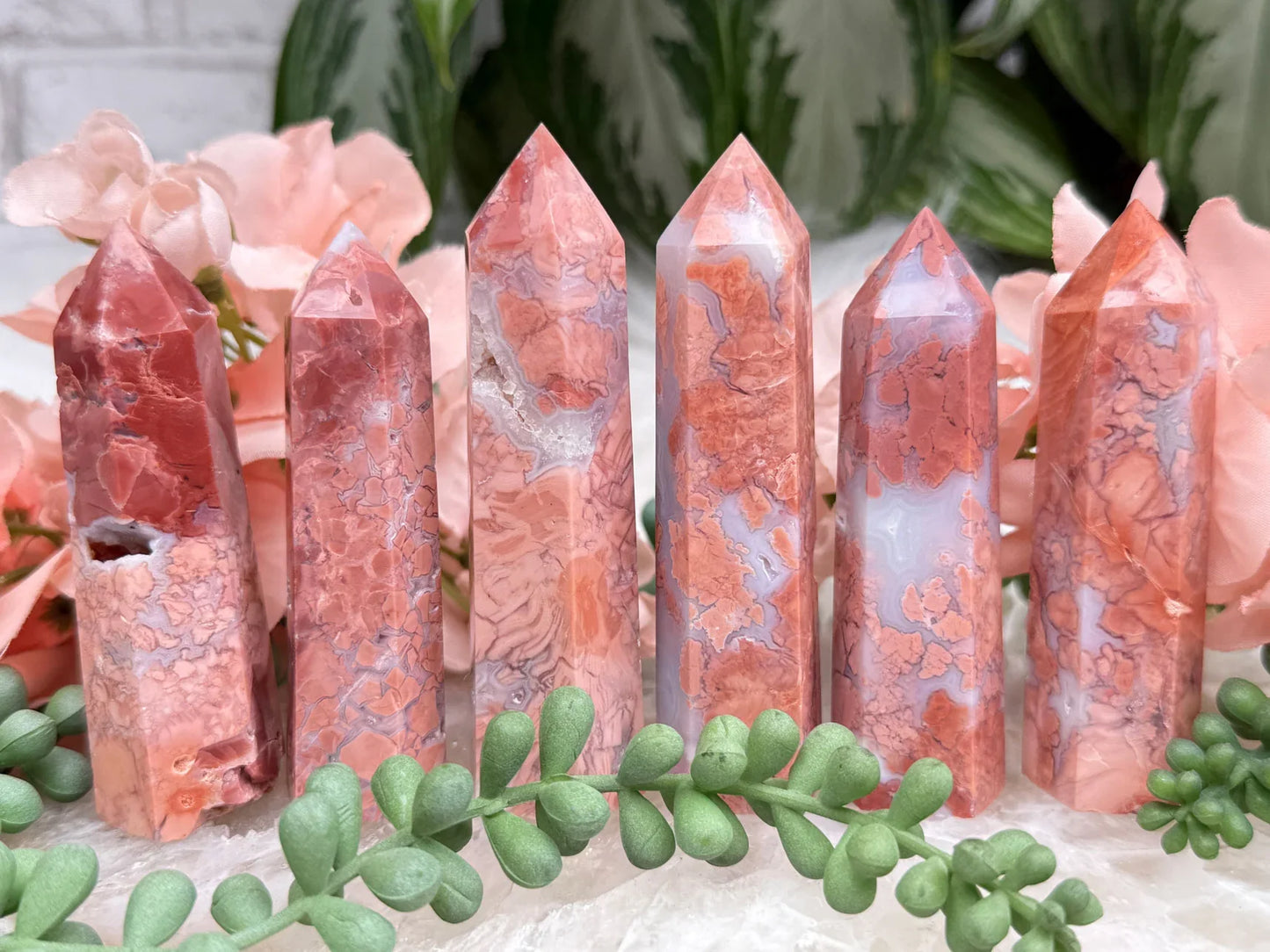 Super cute 'cotton candy agate' crystal points in a pink-orange hue. These are a brecciated jasper mixed with chalcedony (aka the jasper broke during the growth and chalcedony grew between). This material comes from Mexico. It has an overall pink to orange coloring with white and gray hues to the chalcedony. Most of these will wobble a little if the table is hit, but they stand just fine.