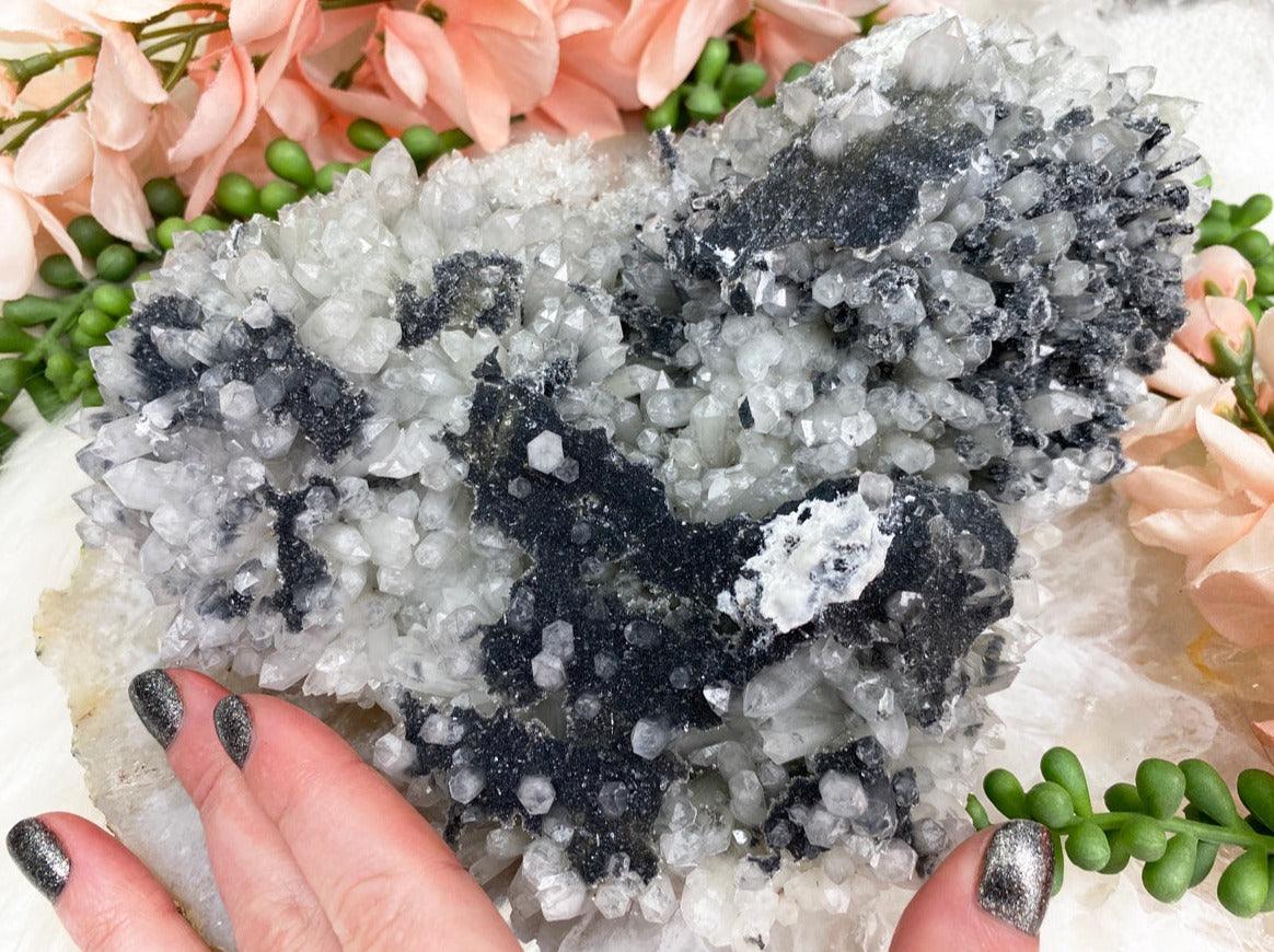 Incredible quartz cluster crystal from the famous Dalnegorsk, Russia area that is known for its beautiful and unique crystal specimens. This quartz cluster is covered in a dark gray hematite with sphalerite and gives it a two tone coloring that gives it an earthy, yet modern appearance. There is a really cool 'shell' formation that the quartz points are growing through. Nice large piece that will make a statement, but small enough that it won't take over your space.