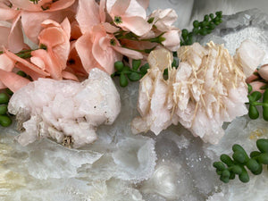 Adorable light pink Dalnegorsk Mangano Calcite crystal clusters with additional calcite rods throughout them. These double terminated raw pink calcite pieces are so incredibly beautiful and have the most amazing energy in person. This calcite will glow under the right lighting, aka it is a UV Reactive Crystal! This Manganoan Calcite crystal features a baby pink coloring with some peach or gray colored rods of calcite.
