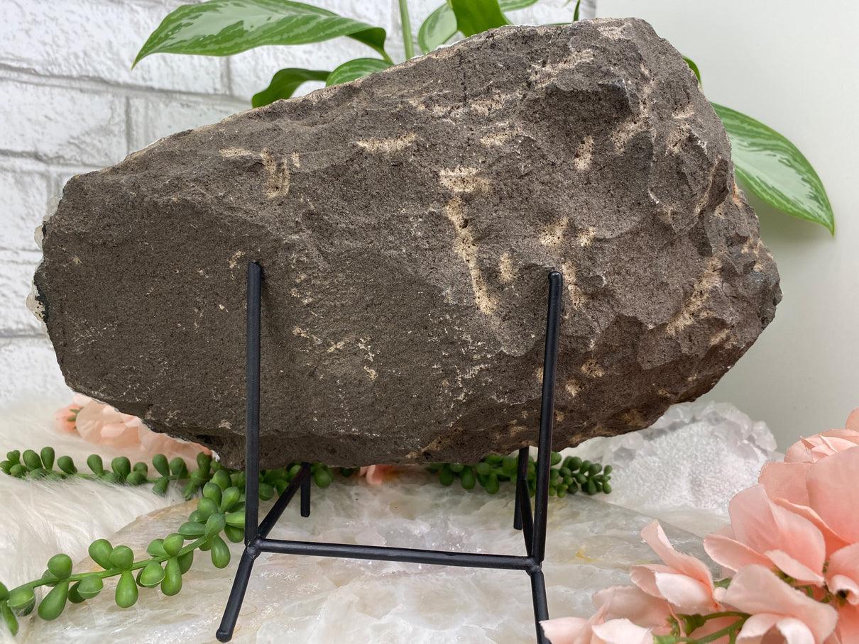 Beautiful druzy chalcedony with chunky apophyllite that is an overall white and gray coloring. This crystal cluster will definitely make a statement! It cannot sit up on its side, it just lays down... and kind of at an angle. I would definitely suggest a stand (not included). In the photos I used the 'large' of the black metal stands on the website.