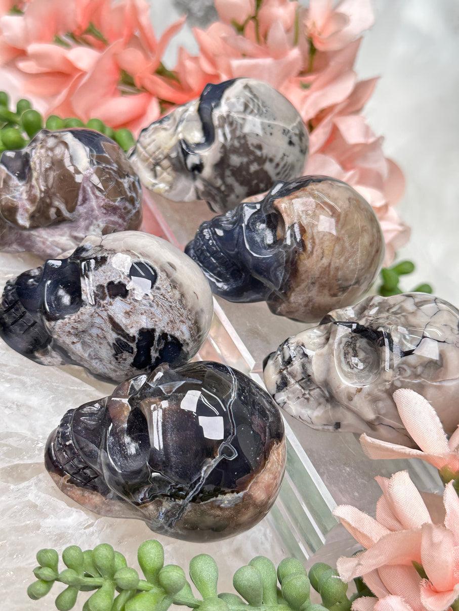 These adorable and unique skull carvings are called 'flame agate' because they have a little UV reaction! They are a mix of matrix stone and chalcedony for the most part. The overall color of these vary with some being more brown and black and some being more gray and black. Either way, I love the contrast! While I like they look super cool just sitting there, some will have a green UV reaction, and some will have a little more of a white reaction. The reaction is not super strong either way.