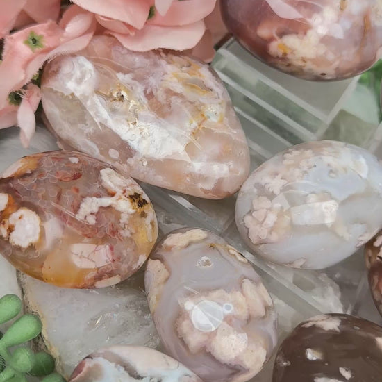 Beautiful Flower Agate palm stones from Madagascar in pink, blue, orange and even a hint of green on one. A couple have some carnelian mixed in. Perfect for keeping next to you while you sleep (dreams) or near your workspace or where you want to manifest and work on your goals. Each one has incredible unique lines and markings! A couple of them are like large naturally shaped palm stones and some are slightly smaller like a pebble or worry stone.