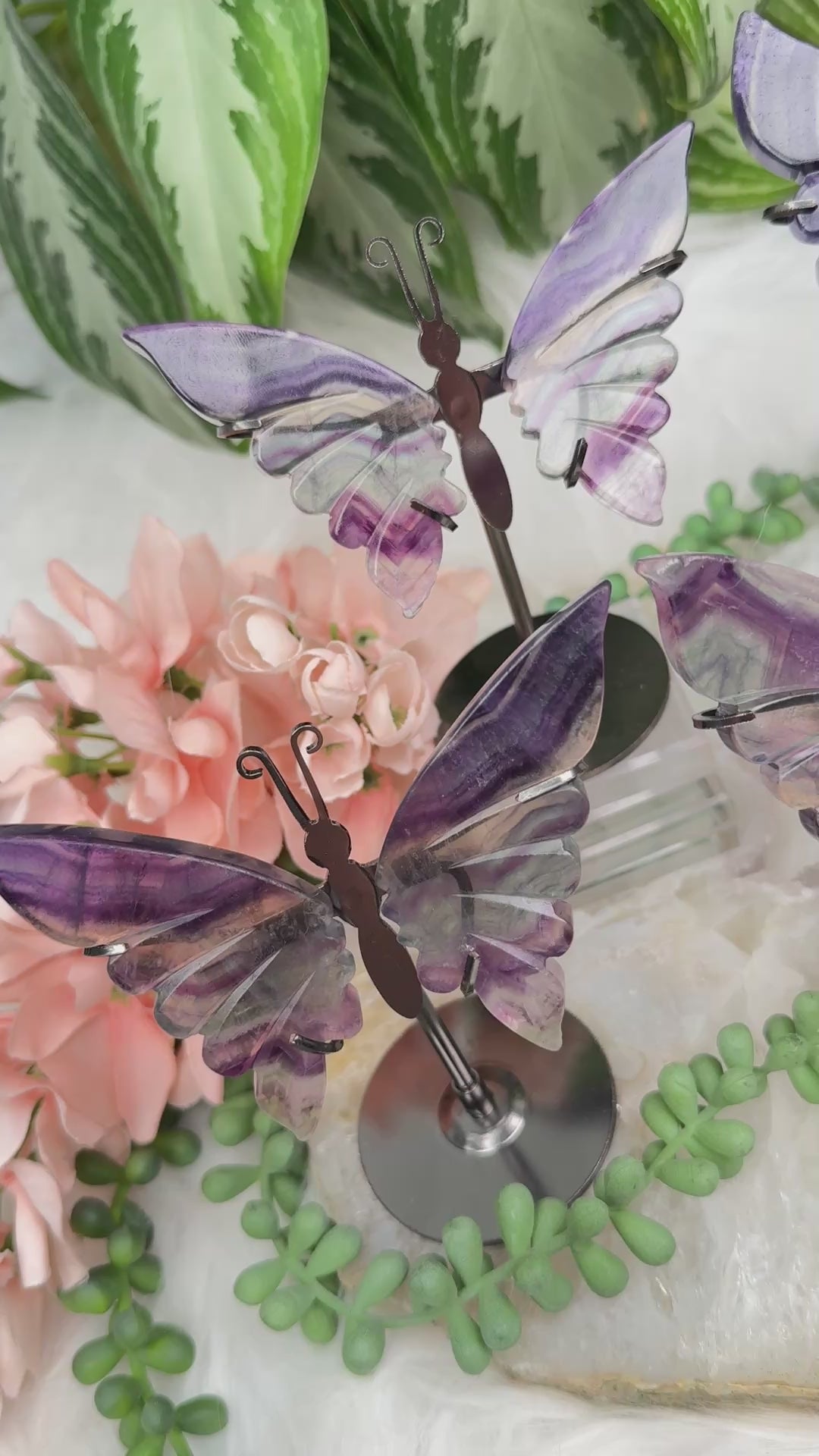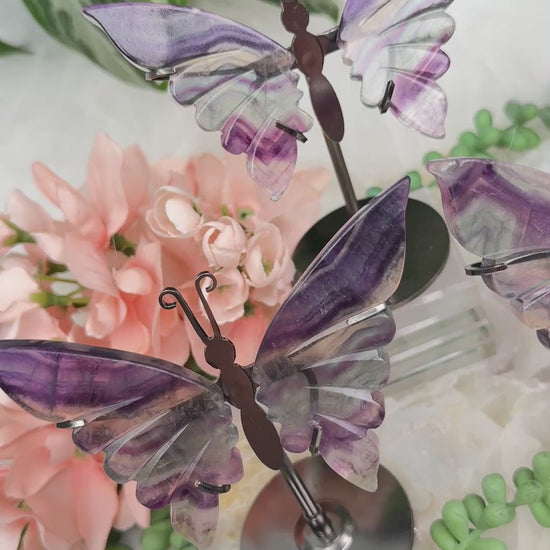 Adorable crystal butterfly display pieces in purple and green fluorite crystal. They all have a unique and slightly different banding of different colors with the clear. They all have a dark gray metal stand with a butterfly body at the top so that it sits between the two crystal wings. They are each one of a kind and you will get to choose your exact piece. Look closely at the photos and video for details like the line carvings to give them an extra special something. These are slightly UV Reactive too.