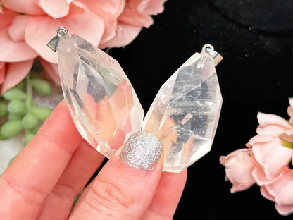 Fun but simple faceted Girasol Quartz Pendants (no chain) that are perfect for daily wear or a special occasion. Girasol quartz is clear quartz with a slightly milky or hazy appearance - please note the amount of this will vary, and some look more clear quartz than white. These crystal pendants are around 1.75"-2" long and about 1" around.