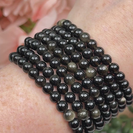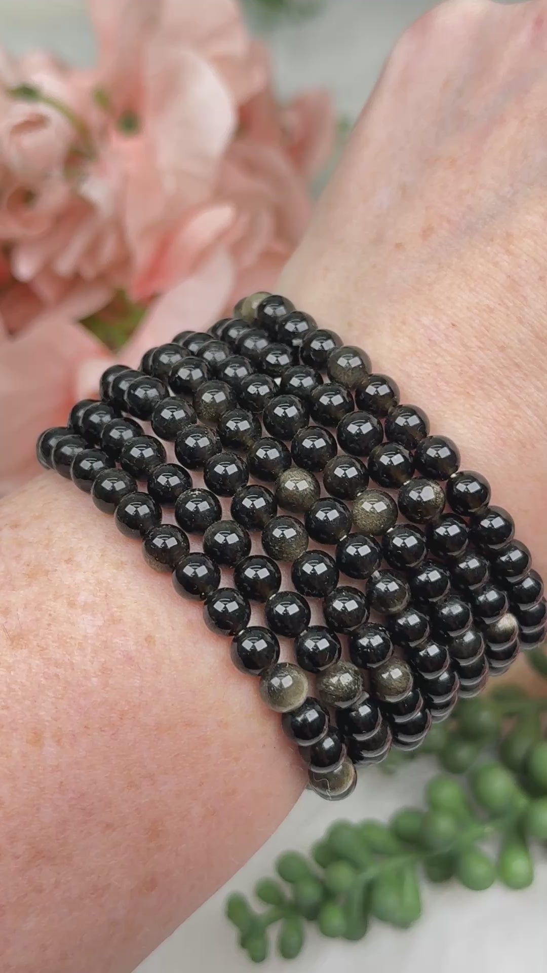 These gold obsidian bracelets have a black bead that will shimmer or 'flash' a brown-to-gold coloring in some parts. These have an elastic interior for stretch.