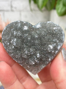 Cute gray agate crystal hearts with a variety of colors, formations, and sparkle action! These cute heart carvings are mostly gray with white and clear quartz with some chalcedony agate lines mixed into some of them. They are all from Brazil except for the larges one which is from Madagascar and has Orca Agate. Take a look a the photos and video to see each one 360.