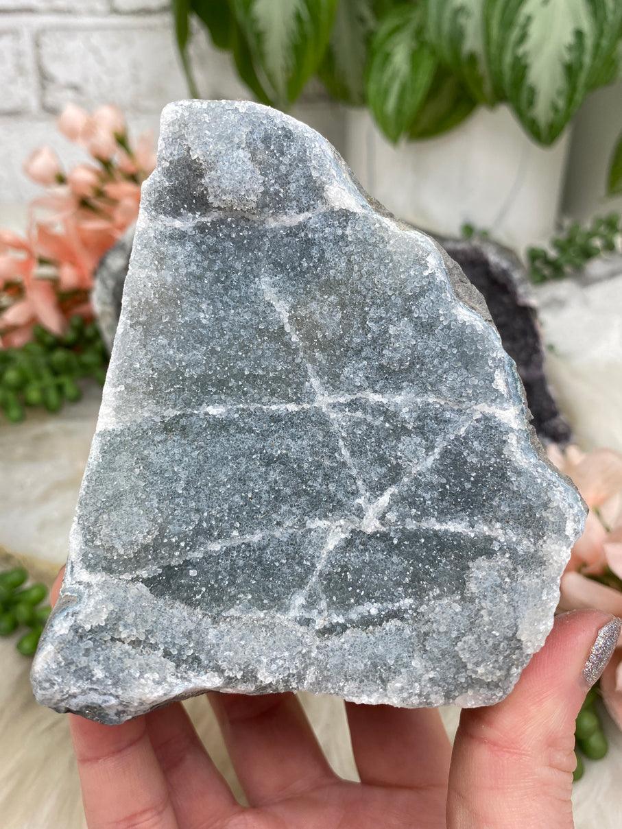 Small Gray-ish Amethyst crystal clusters from Brazil. These little crystals are a great addition to just about any home decor theme due to their subtle colors. Some are gray, some are green, some are purple, but they all have a somewhat gray vibe. They all have tons of sparkle action! Some of these pieces can all sit a couple different ways, so you can change up the look. They have raw and rough cut sides and backs to them on the matrix stone. Check out the video to see them in action.