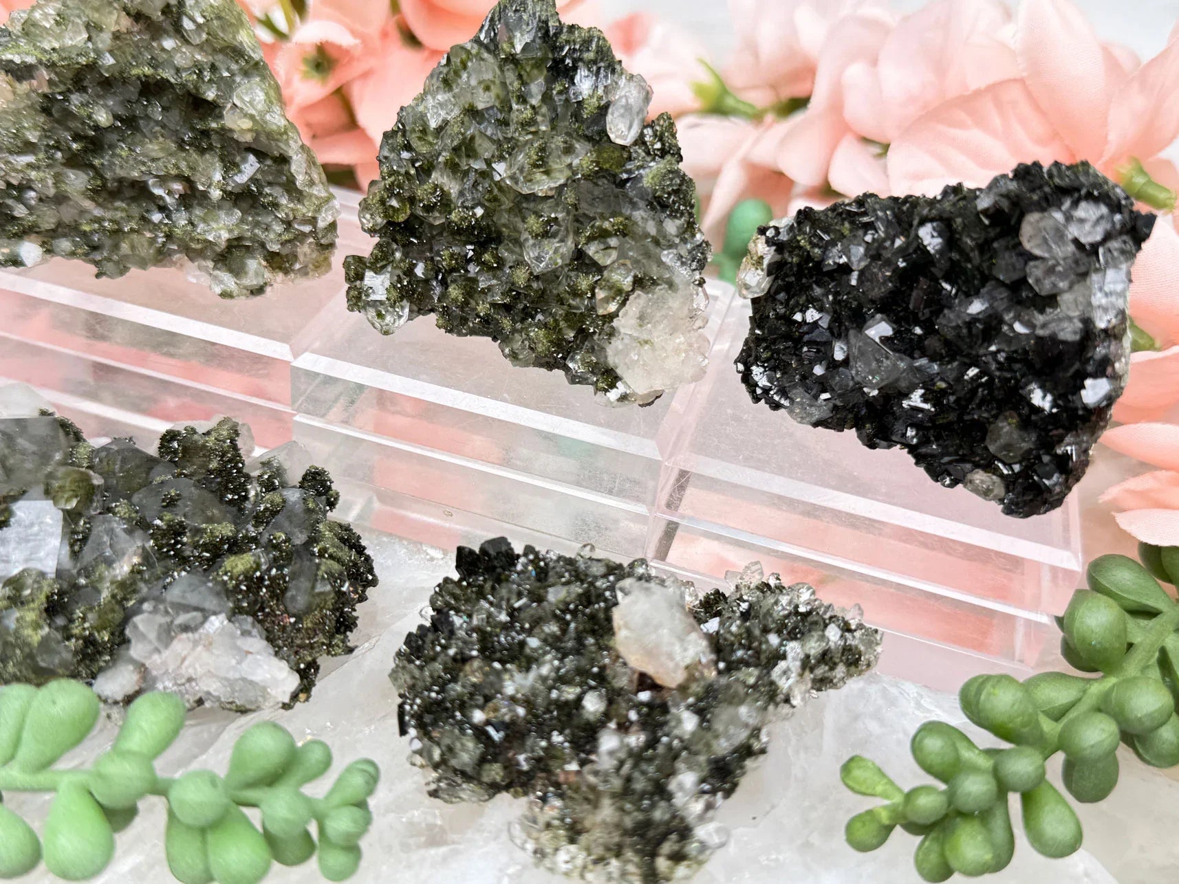Stunning green epidote quartz clusters from Turkey. These stunning clusters have been nicknamed by some as fairy or forest epidote due to their deep coloring and sparkle. Many of these even have little rainbows in the quartz. The back three pieces can either stand on their side or lay down, while the two in the front can only lay down. Some of these have amazing back sides too. Check out the video to see them all the way around. Choose exact piece.