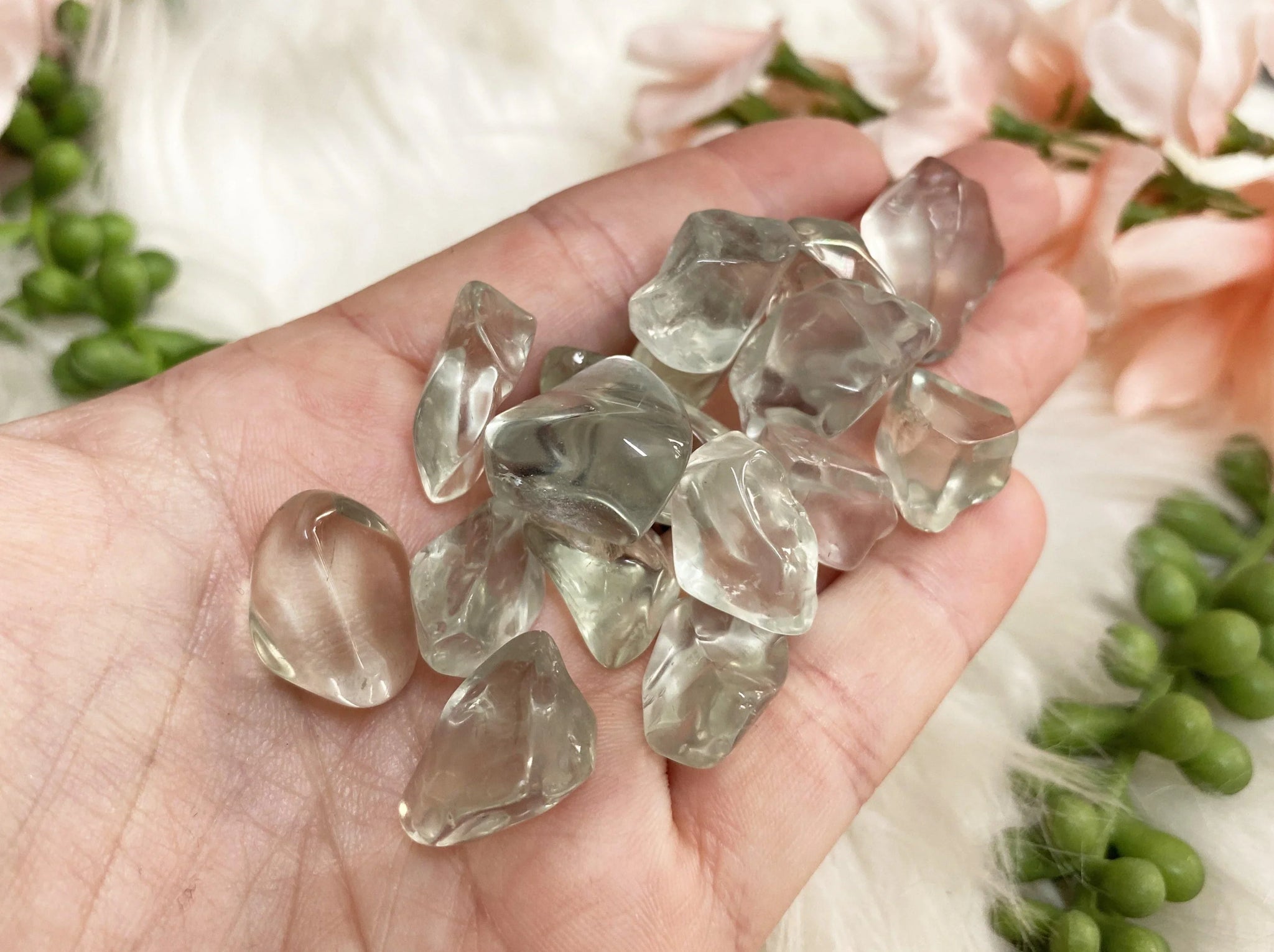 Prasiolite is a stone of amplifying energies! Prasiolite is a green form of amethyst that is known to amplifiy the energies within your own heart. This is for a 50-gram set of prasiolite semi-polished tumbles. The size, shape, and quantity of each set will vary slightly. The photo with the bag in my hand is a real set for example. These are semi-polished, so they retain some natural shape and edges.