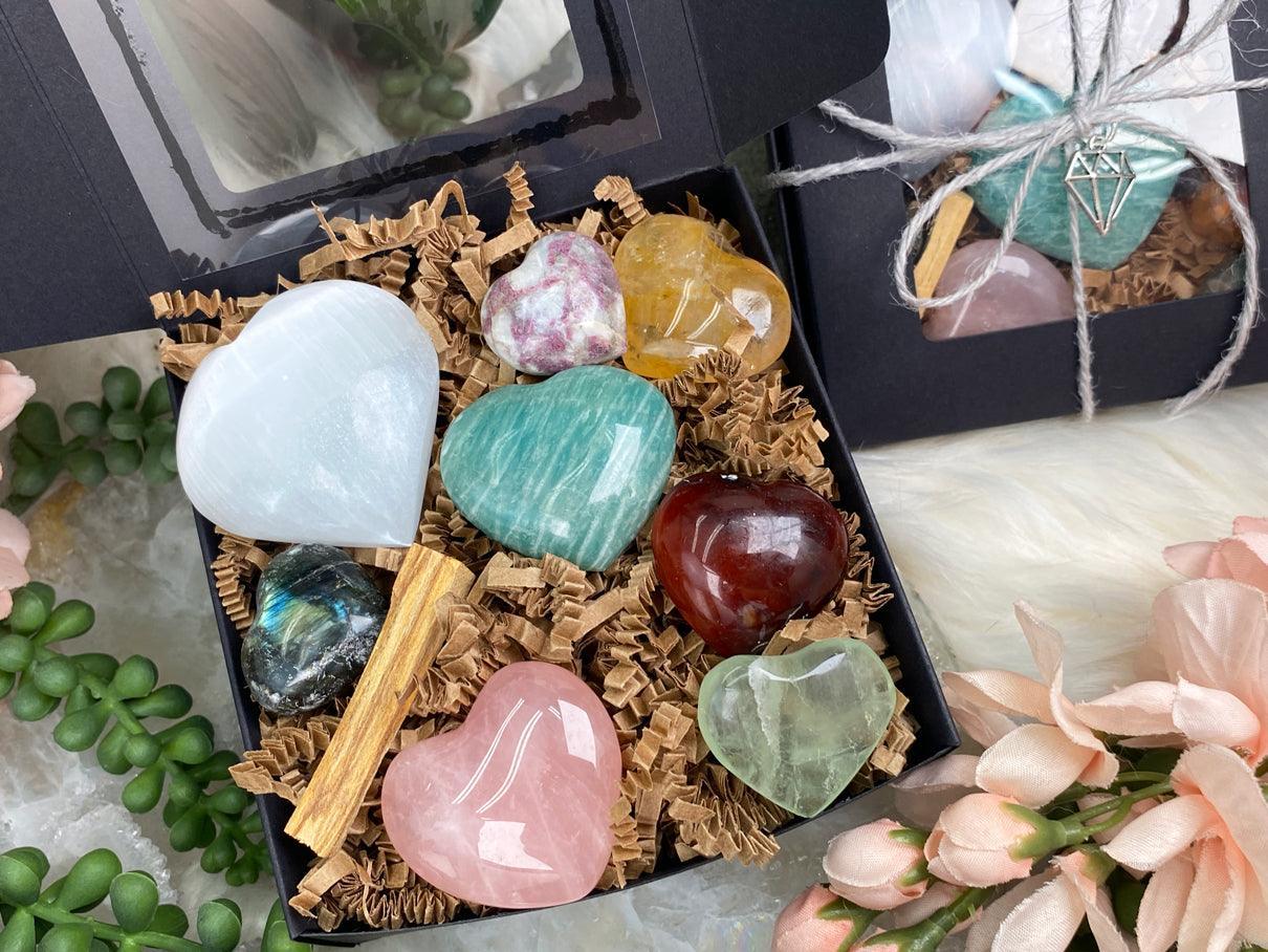 The set comprises eight distinct stone hearts, each varying in size and possessing its own individual charm and metaphysical benefits. Alongside these heart-shaped treasures, you'll find a mini stick of Palo Santo wood, known for its cleansing and purifying properties. These crystal hearts not only serve as beautiful worry stones but also make for meaningful and thoughtful gifts, sharing the positive vibrations of crystals with friends, loved ones, or even as a self-care treat.