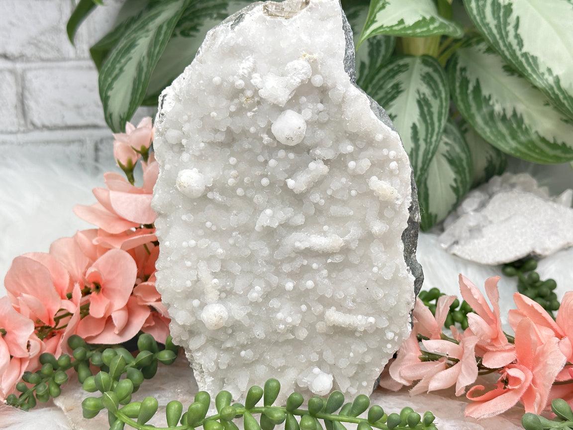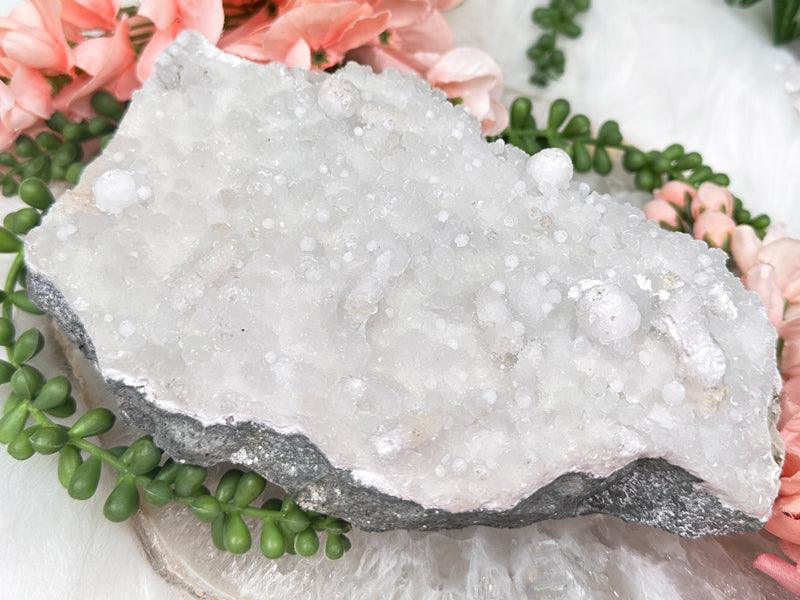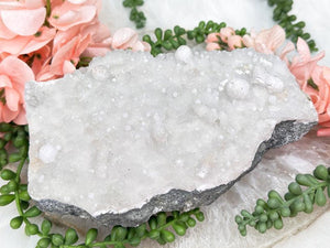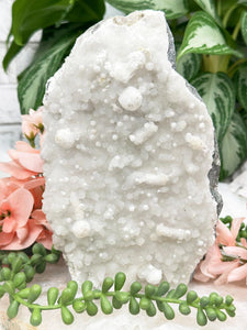 Stilbite's loving and calming energy is thought to soothe emotional wounds, making it easier to release past traumas and embrace self-love and compassion. When combined with Apophyllite's ability to enhance spiritual insight and communication with higher realms, the Stilbite Apophyllite combination is considered a powerful tool for meditation and inner exploration. It is believed to encourage personal growth, inspire clarity of thought, and promote a sense of inner peace and contentment. Whether used in healing grids, meditation practices, or simply carried as pocket stones, these crystals are cherished for their ability to foster emotional healing, spiritual growth, and a profound sense of well-being.