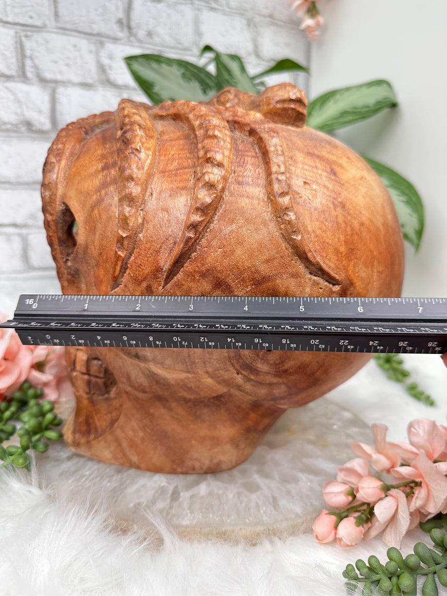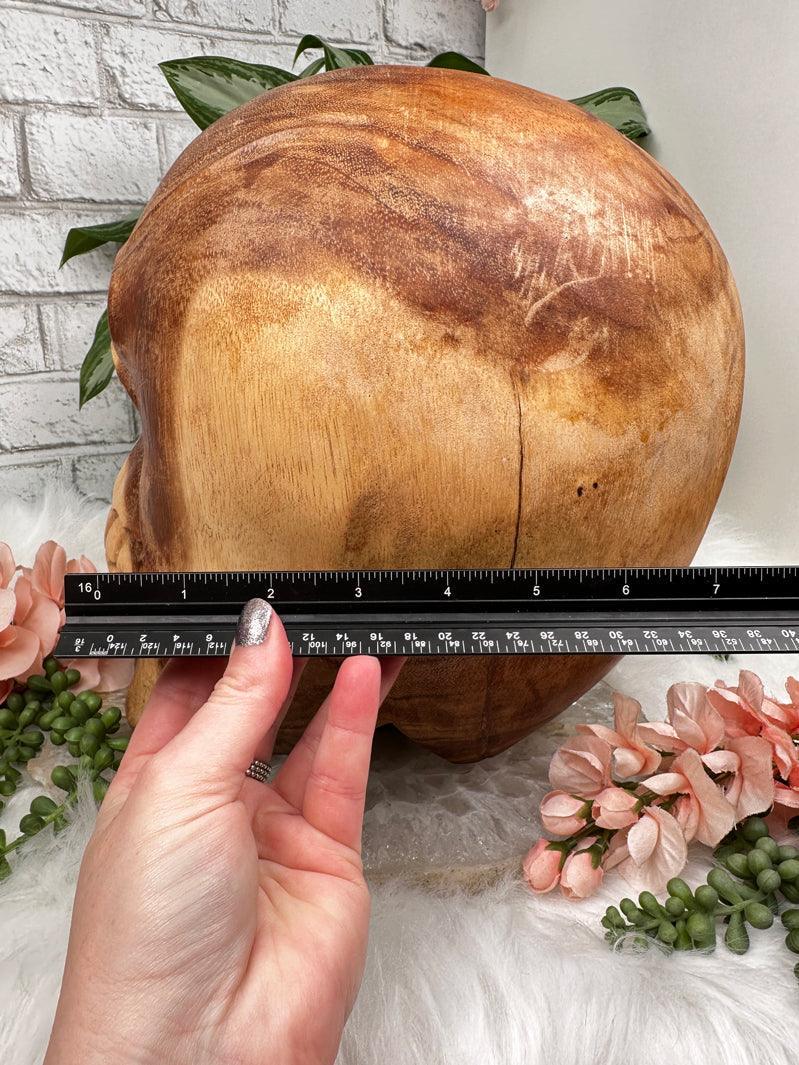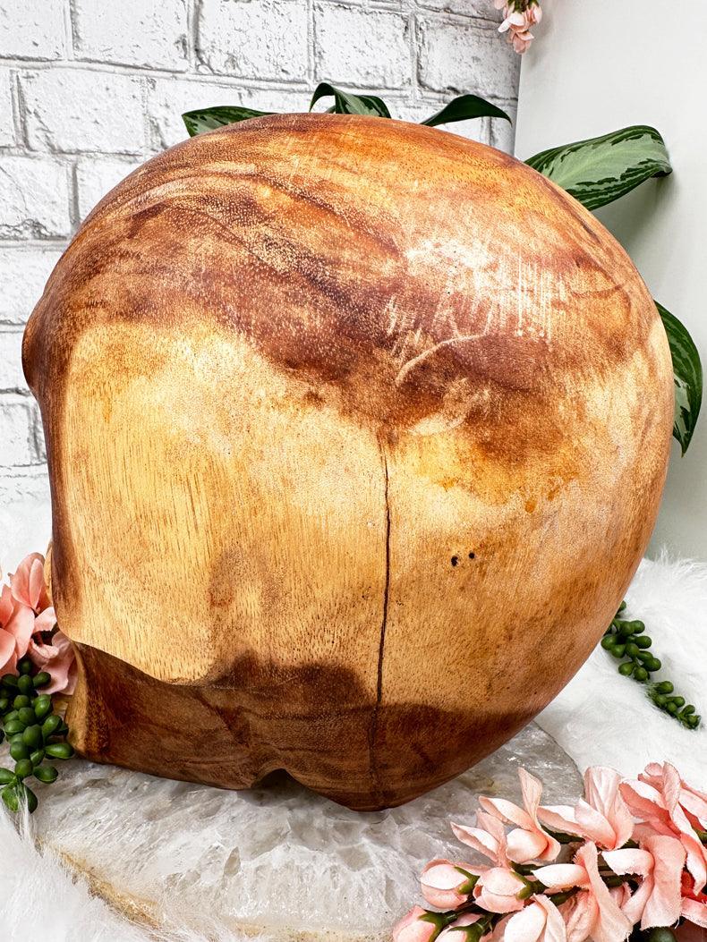 What makes these wooden skull carvings truly unique are the captivating natural imperfections that adorn them, enhancing their rustic charm. You may notice small holes on the bottom, remnants of the carving process, but rest assured that they don't diminish the overall appeal or structural integrity of the skulls.