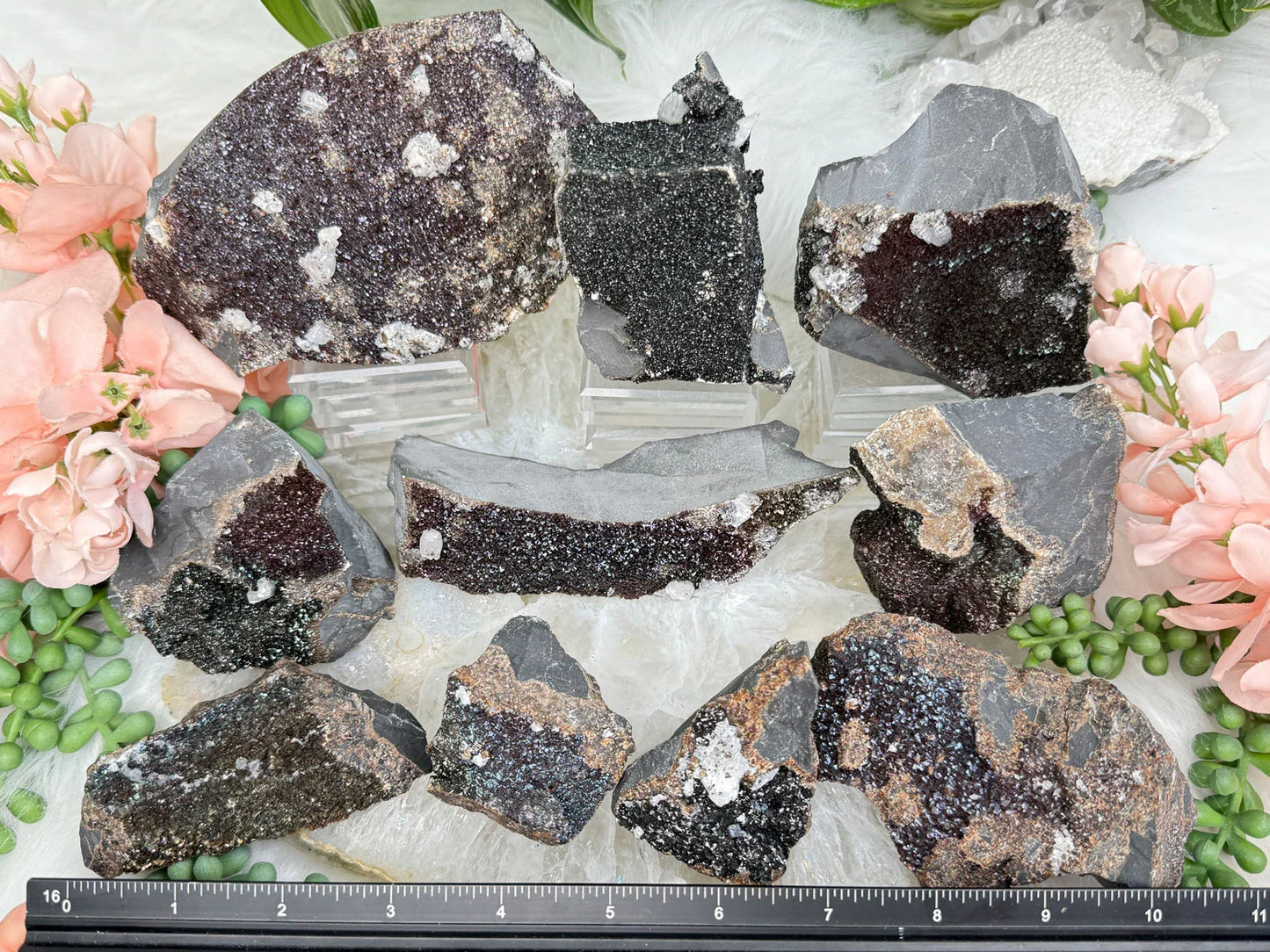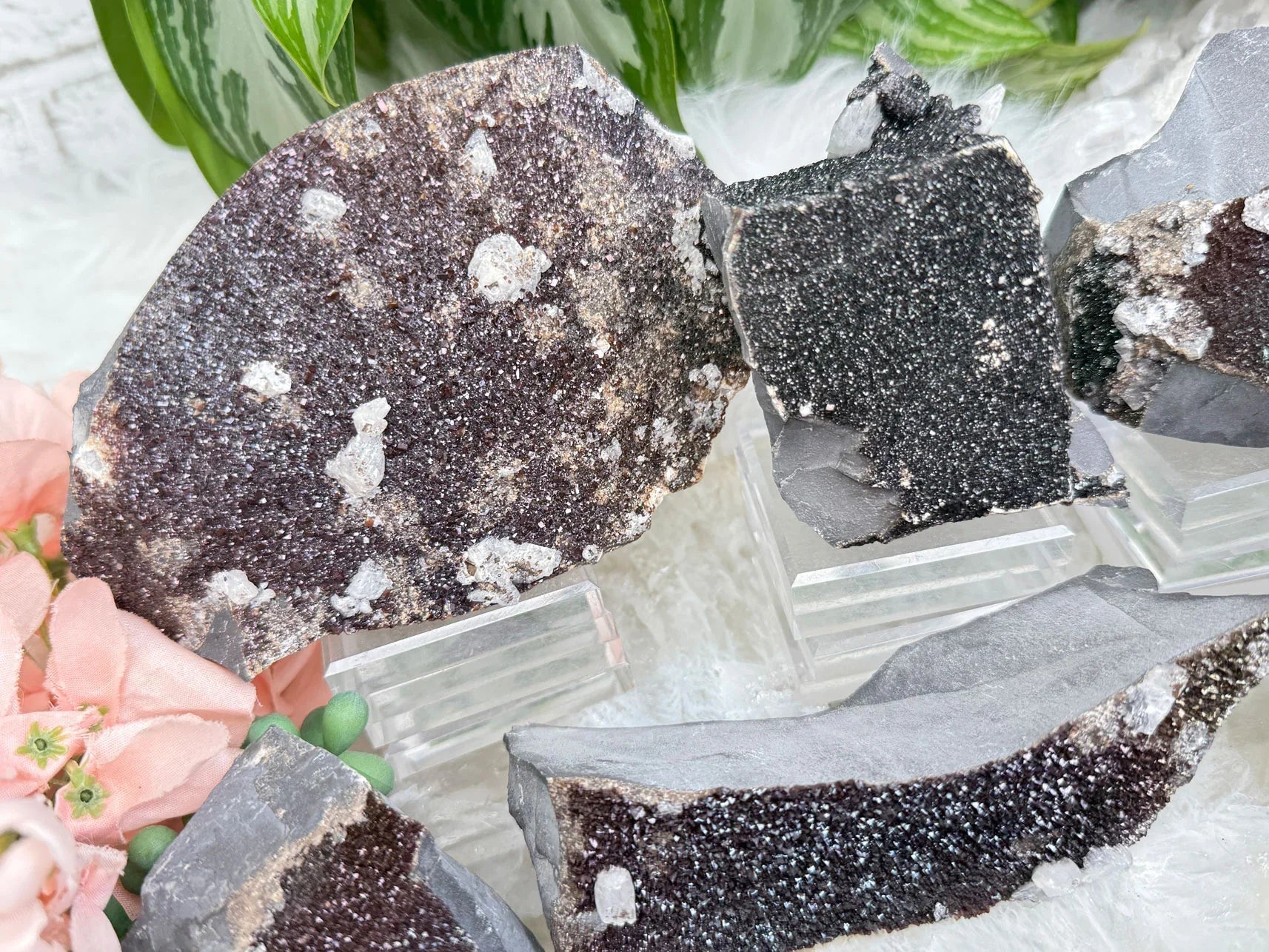 Super cool naturally iridescent dark brown-black calcite crystal clusters with white dogtooth calcite pieces on some of them.  This amazing and super cool find from Iowa was actually discovered in the 60s and 70s, but is just now making its way out into the world these past couple years! The iridescent colors are due to a super thin later of dolomite and other minerals on top of the calcite. Each one is unique and will shimmer a different set of colors.A couple of these are more black than a specific color. And some have a maroon brown coloring that doesn't really show as a color shift.