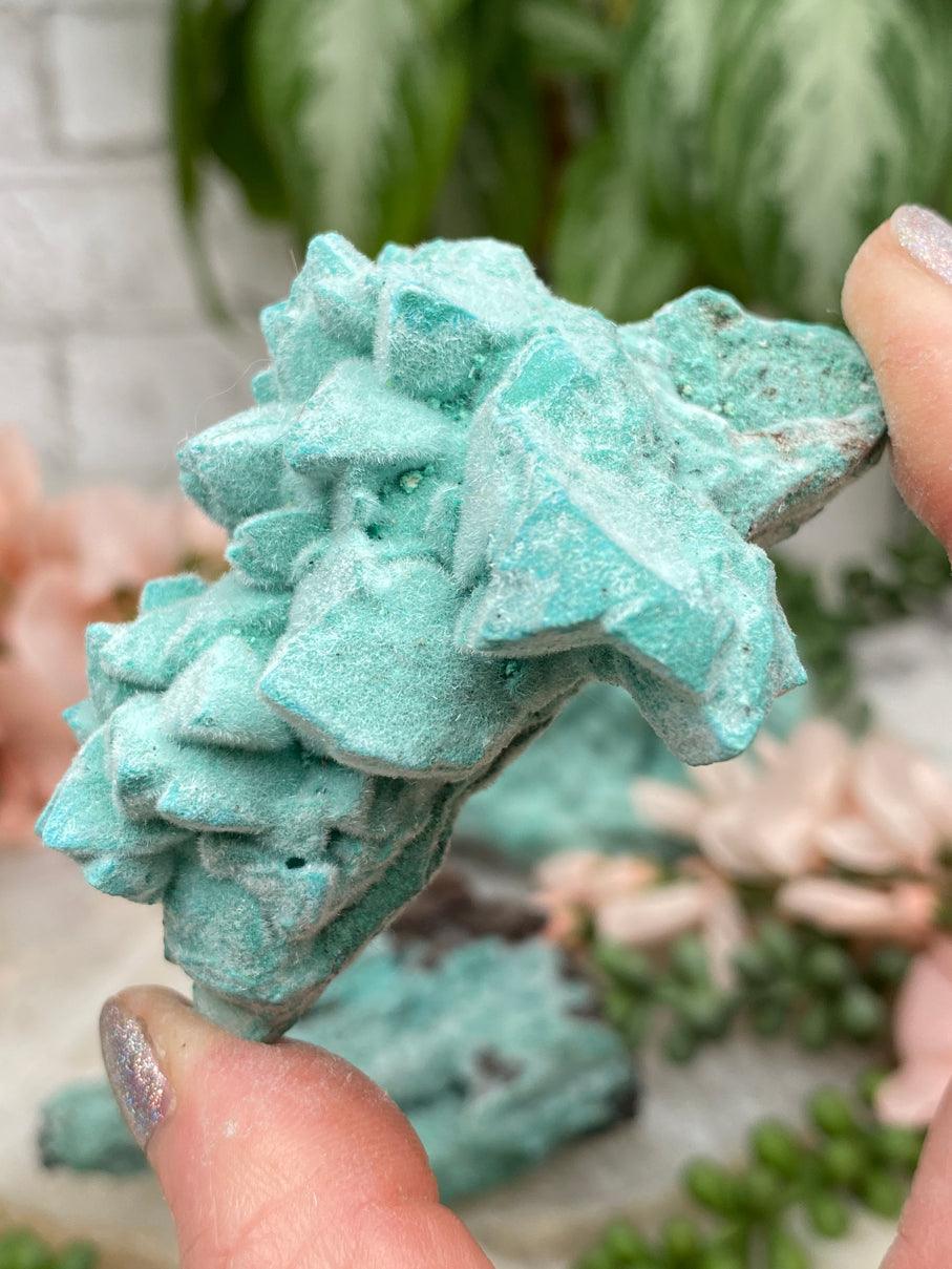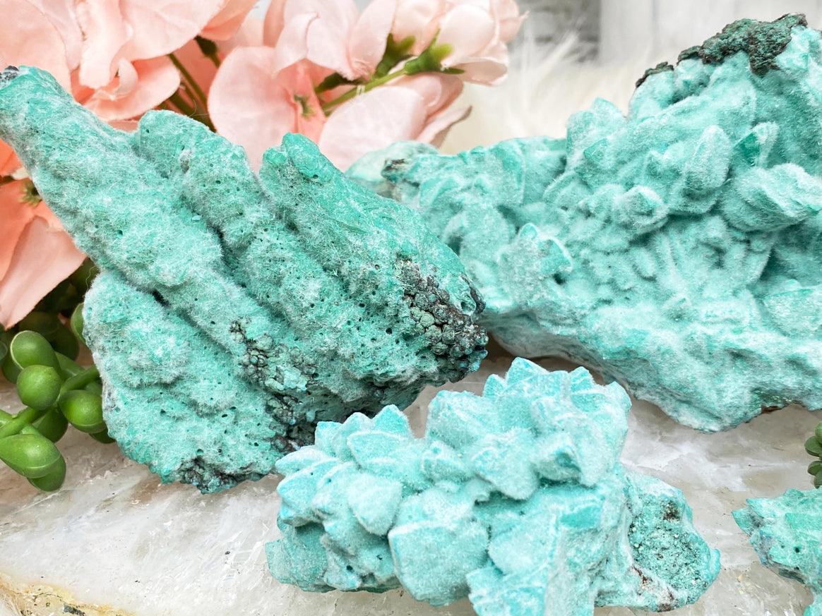Teal blue Kobyashevite crystal clusters from Durango, Mexico. You have to check out the detail on these rare beauties, but also be sure to read the info below. I love the calming ocean vibes and color of these specimens. And their little 'furry' coats are just too cute. Blue Kobyashevite are great pieces for a pop of color in your home, or on your crystal display.