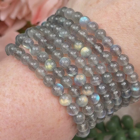 Flash colors and bead sizes may vary slightly. ONE Labradorite Bracelet will be selected for you. No requests for colors or specific pieces.