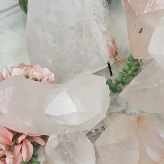 Super chunky quartz clusters and points from Brazil.  These are all unique in their own way, some have hematite, some are self-healed, some have rainbows and more! The large one Middle Row Right is not only self healed, but was a point that broke in formation and then re-healed bent, which is very unusual. A couple have twin points, some have 'keys' where there was a point previously that came apart. Be sure to look at the video to see each piece full 360 for the best peek at these because each one has a variety of unique features.