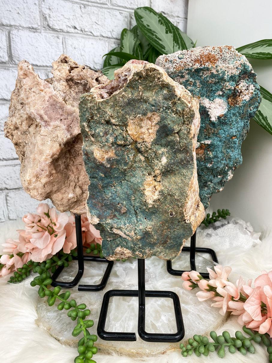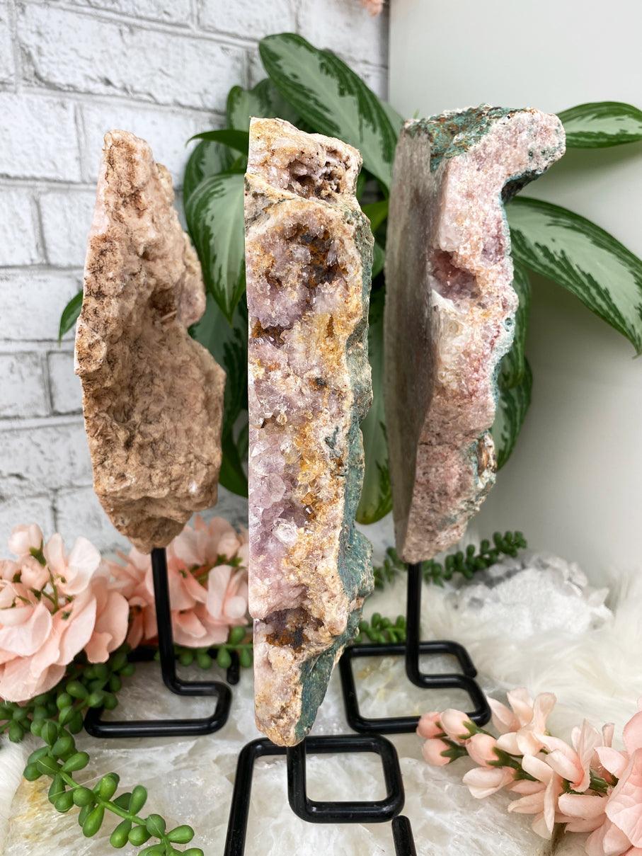 Large pink amethyst display crystals on metal stands. Pink amethyst is a form of amethyst that gets its color from hematite and iron in the crystal. Some have some great crystalized spots. Check the video for a full look at them. Great pieces for a nightstand, side table, or desk. These all have a black metal stand that is attached to the crystal itself.Â