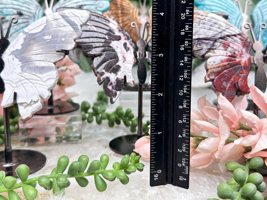 Adorable crystal butterfly display pieces in a variety of stones. Amazonite, Tiger Eye, Moss Agate and Crazy Lace Agate. They all have a dark bronze metal stand with a butterfly body at the top so that it sits between the two crystal wings. They are each one of a kind and you will get to choose your exact piece. Look closely at the photos and video for details like the line carvings to give them an extra special something.
