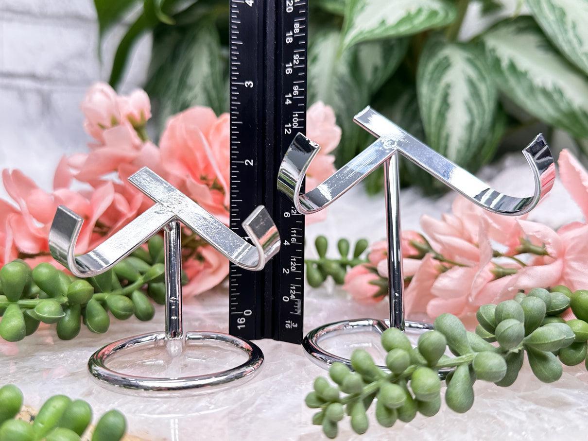 Simple metal crystal heart stands available in silver, black, or gold. These metal stands work best for hearts, but you can also use them for some raw specimens too! You just need to make sure it can grab onto the bottom edge! A might be able to bend the arms a bit to make them look better for specific hearts. You cannot bend them to change the width though, just to make the arms tighter or for the heart to sit more up and down.