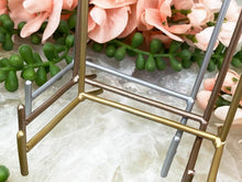 Simple metallic metal display stands perfect for propping up crystal slabs or raw crystal clusters that don't sit in the cutest way. These crystal stands are available in three color options (4 if you count the black stand on a different listing)! These have a black metal base and I have coated them in silver, gold and rose gold paint options!