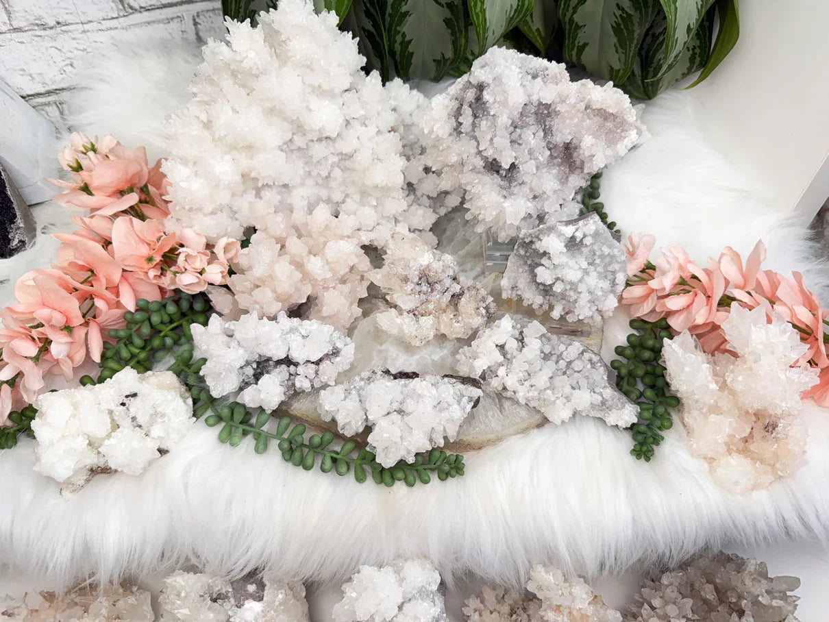 Stunning aragonite crystal clusters from Mexico with unique formations and coloring. These are also referred to as cave calcite, but I personally think they look like coral! There are a mix of white with gray, some with tan hues, some with a very slight pink hue to them, and more. The largest back left can only lay flat, but would also look great in a stand (not included, but is available on the website - large would be best, but medium is used in this photo).