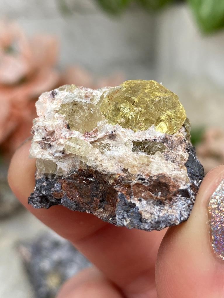 Small yellowish green apatite crystals in matrix stone from Mexico. Each of these pieces is unique, but they have a similar overall look with either a dark matrix stone, or a white-gray chalcedony matrix. Some of these pieces have actual terminations to the green apatite piece. Some even have rainbows!