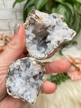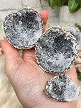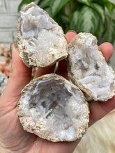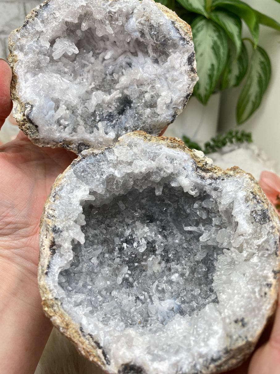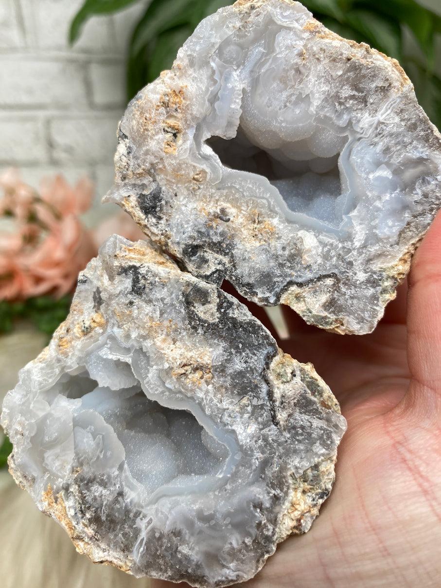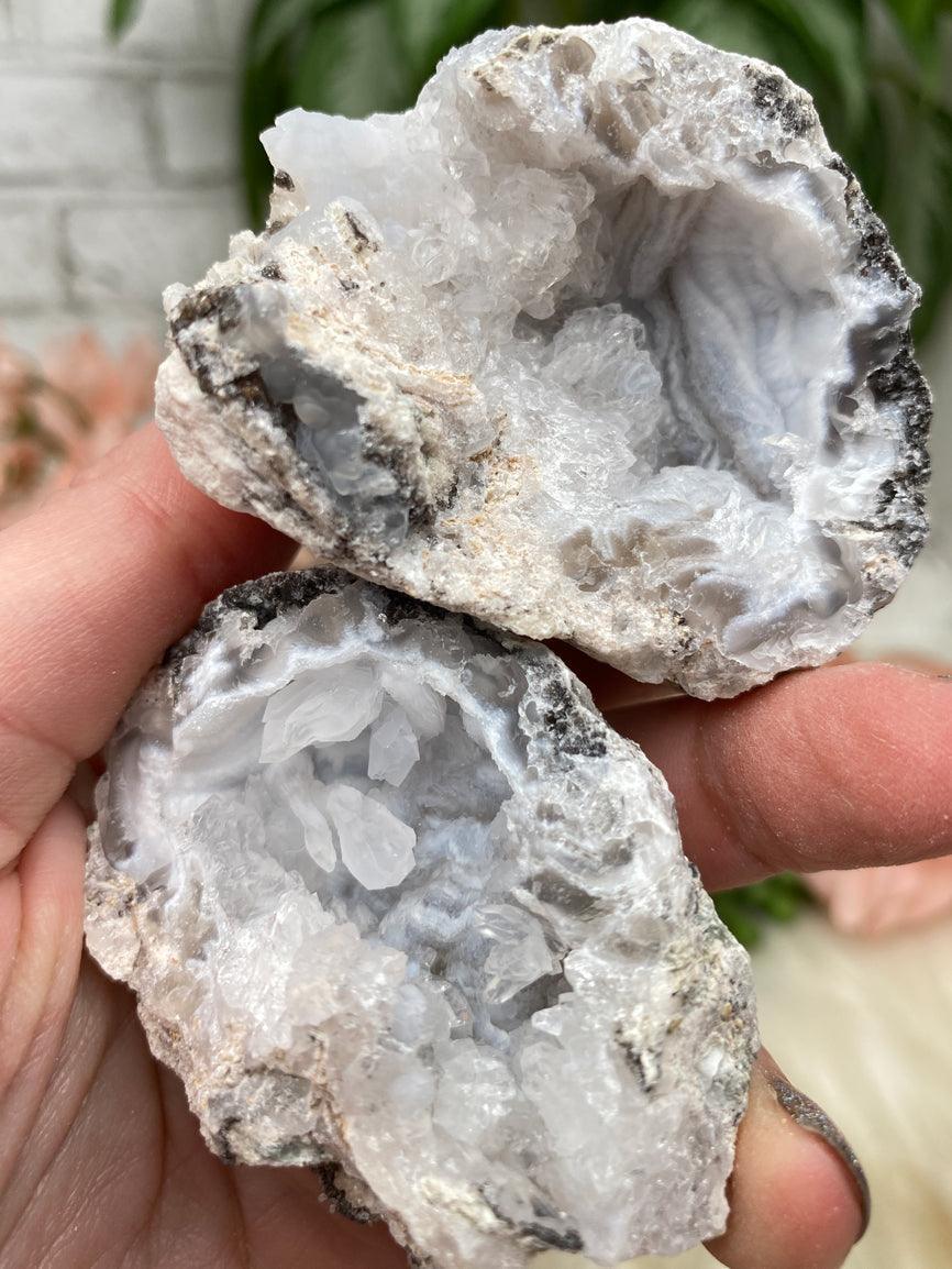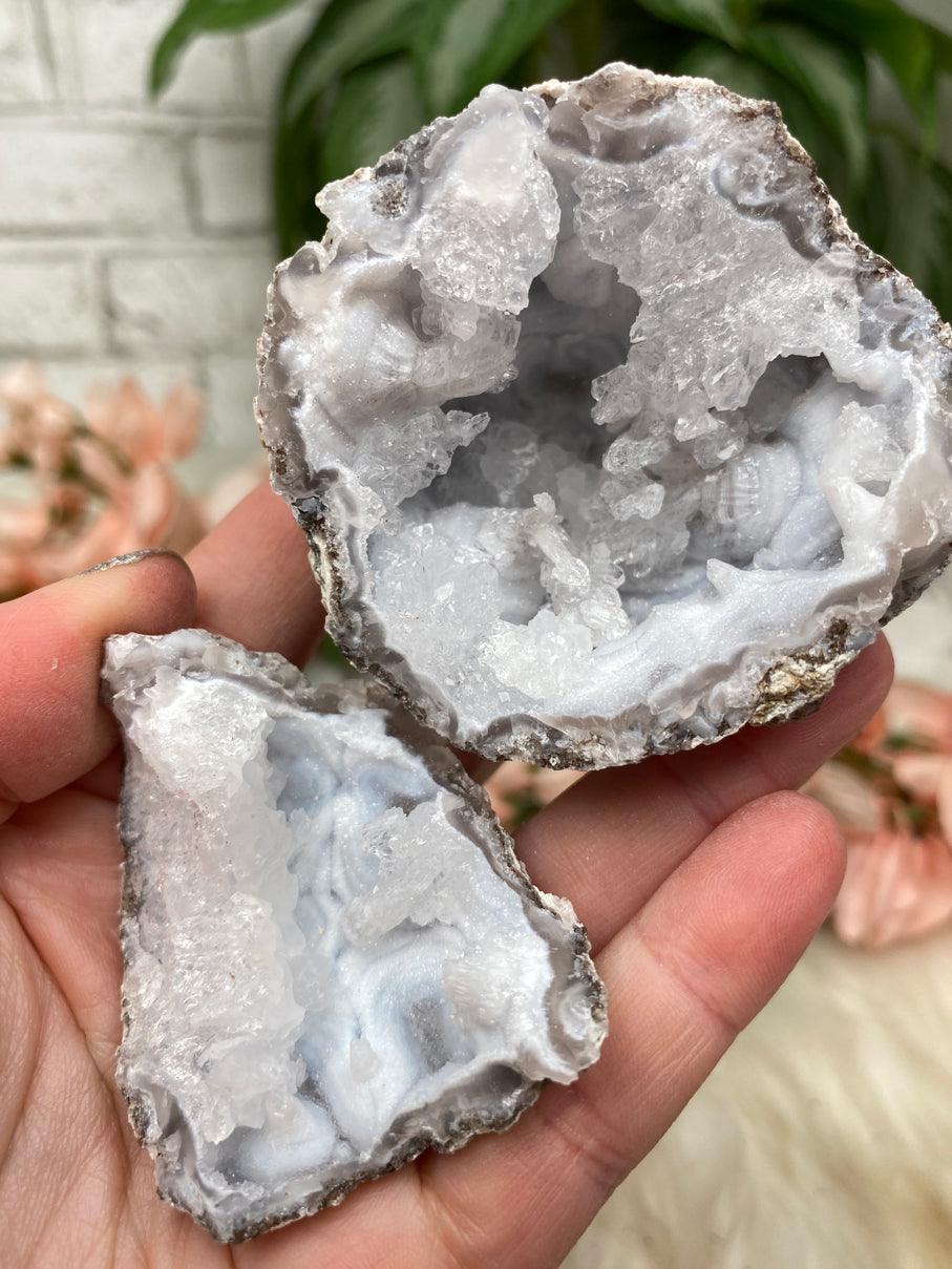 Cute little Trancas geodes from Mexico with a mix of quartz and chalcedony. Some of them are actually UV reactive and will glow green! Mostly white coloring, some with blacks and grays. Unique formations from chunky quartz to druzy chalcedony and even some stalactites. Please note that not all of these Trancas geodes are pairs and even the ones that are together may not go back together as a whole.