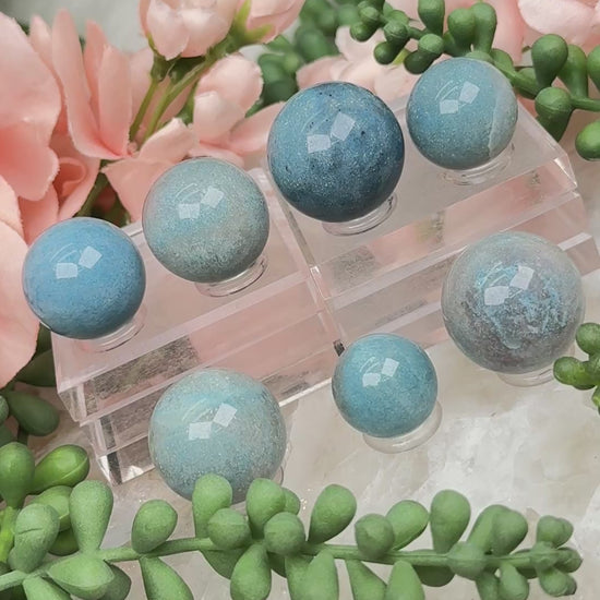 Beautiful naturally colored Blue Trolleite spheres from Brazil. These mini Trolleite spheres have a wide range of blue colors from a vibrant (but soft) aqua teal coloring to a light gray-blue. Choose your exact sphere.