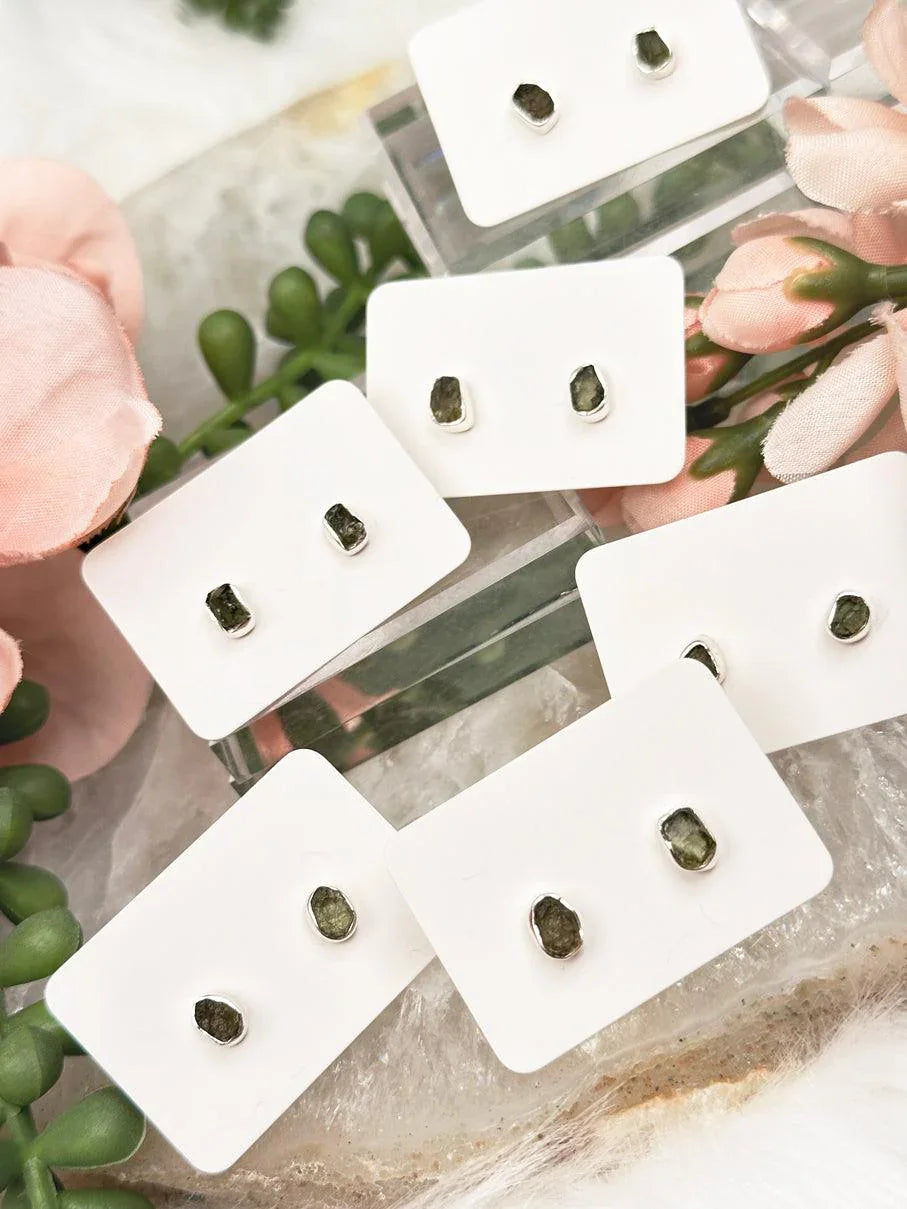 Cute and simple green moldavite earrings with 925 sterling silver posts and finishes. This moldavite is of course from Czech Republic. Each earring is a delicate size and has a silver edging for the setting.